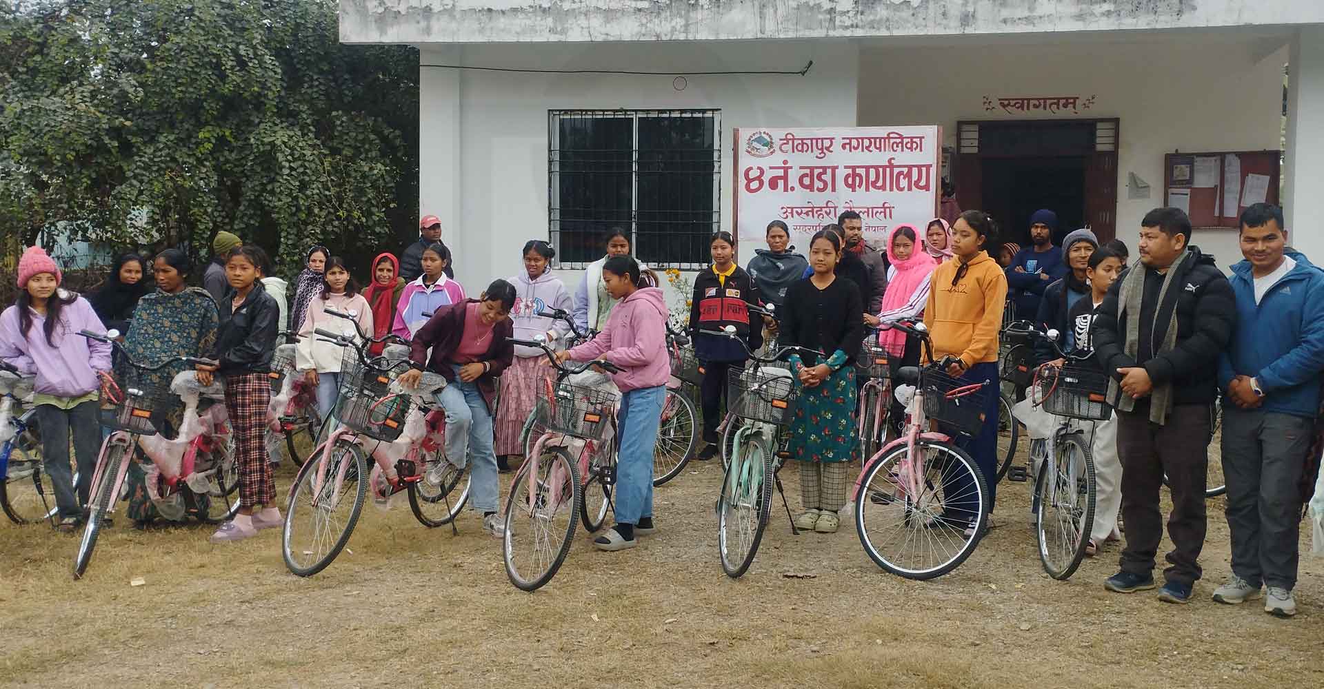 कक्षा ११ मा अध्ययनरत सन्ध्या चौधरीलाई पनि क्याम्पस जान समस्या हुन्थ्यो । “बिहान ६ बजे कलेजका लागि हिँड्नुपर्ने भएकाले समस्या थियो”, उहाँले भन्नुभयो, “अब सजिलो भएको छ । आजदेखि कलेज साइकलमा जान्छु ।” टीकापुर नगरपालिका– ४ ले कक्षा ९ देखि १२ सम्म सामुदायिक विद्यालयमा अध्ययनरत विपन्न तथा जेहेन्दार छात्रालाई साइकल वितरण गरेको हो । वडाले साइकल नभएर टाढा विद्यालय हिँडेर जान बाध्य छोरीहरुको शैक्षिक विकासका सहयोग होस् भनी साइकल वितरण गरेको जनाएको छ ।