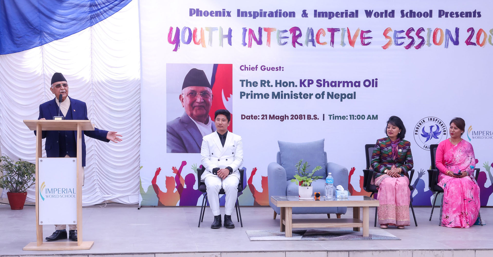 श्रीपञ्चमीका अवसरमा फिनिक्स इस्पिरेसन र इम्प्रेरियल वल्र्ड स्कुलद्वारा आज आयोजित ‘युवा अन्तरक्रिया’ मा प्रधानमन्त्री ओलीले विकासका पूर्वाधार बनाएर र आधुनिक गुणस्तरीय शिक्षा दिएर युवालाई विश्व बजारको प्रतिस्पर्धी बनाउने सङ्कल्प पनि गर्नुभयो ।