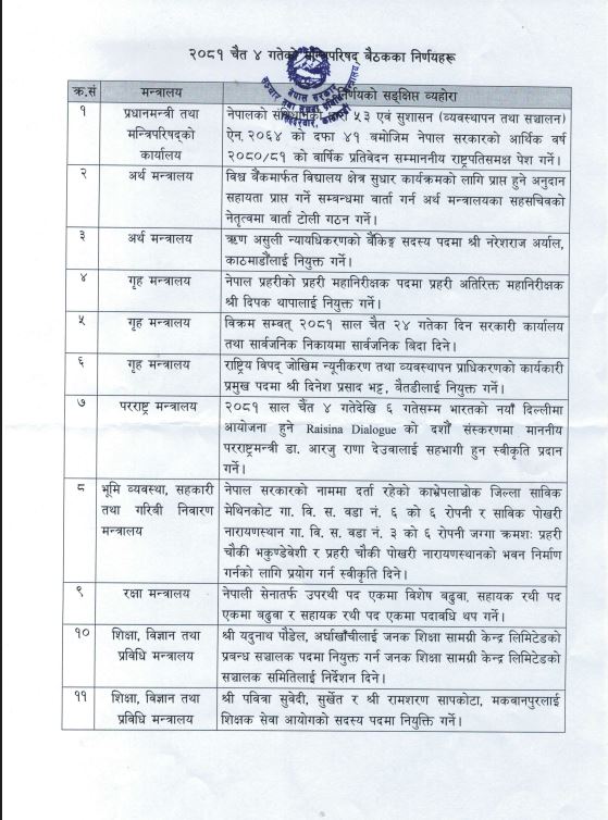 त्यस्तै, विश्व बैंकमार्फत विद्यालय क्षेत्र सुधार कार्यक्रमको लागि प्राप्त हुने अनुदान्न सहायता प्राप्त गर्ने सम्बन्धमा वार्ता गर्न अर्थ मन्त्रालयका सहसचिवको नेतृत्वमा वार्ता टोली गठन गर्ने निर्णय गरेको । बैठकले ऋण असुली न्यायधिकरणको बैंकिङ्ग सदस्य पदमा नरेशराज अर्याललाई नियुक्त गरेको छ ।