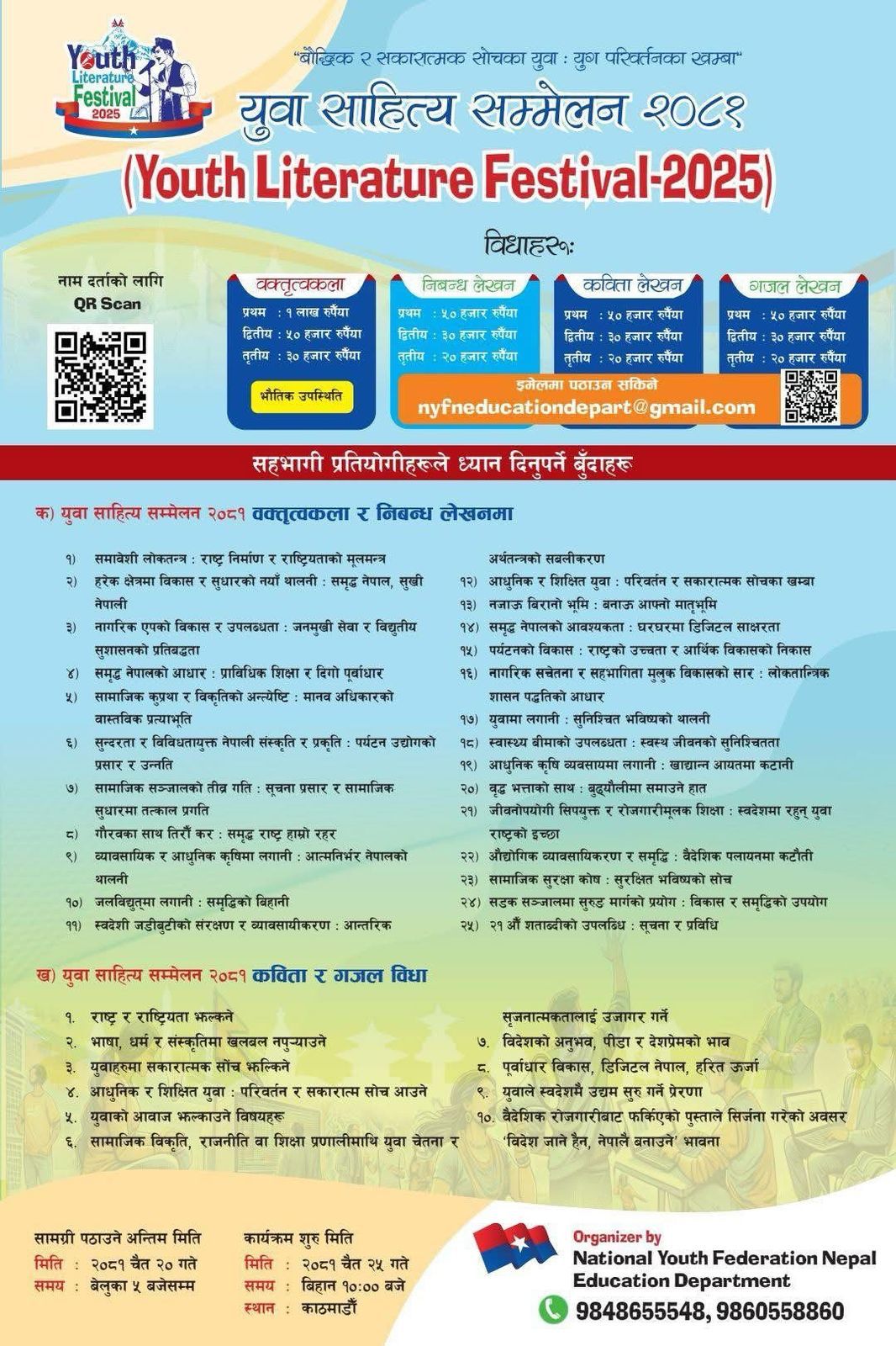 राष्ट्रिय युवा संघ नेपाल, शिक्षा विभागले ‘बौद्धिक र सकारात्मक सोचका युवा: युग परिवर्तनका खम्बा’ भन्ने मूल नाराका साथ ‘युवा साहित्यिक सम्मेलन २०८१’ आयोजना गर्दैछ। यस प्रतियोगितामा गजल, कविता, निबन्ध, र वक्तृत्वकला विधाहरू समावेश छन्।