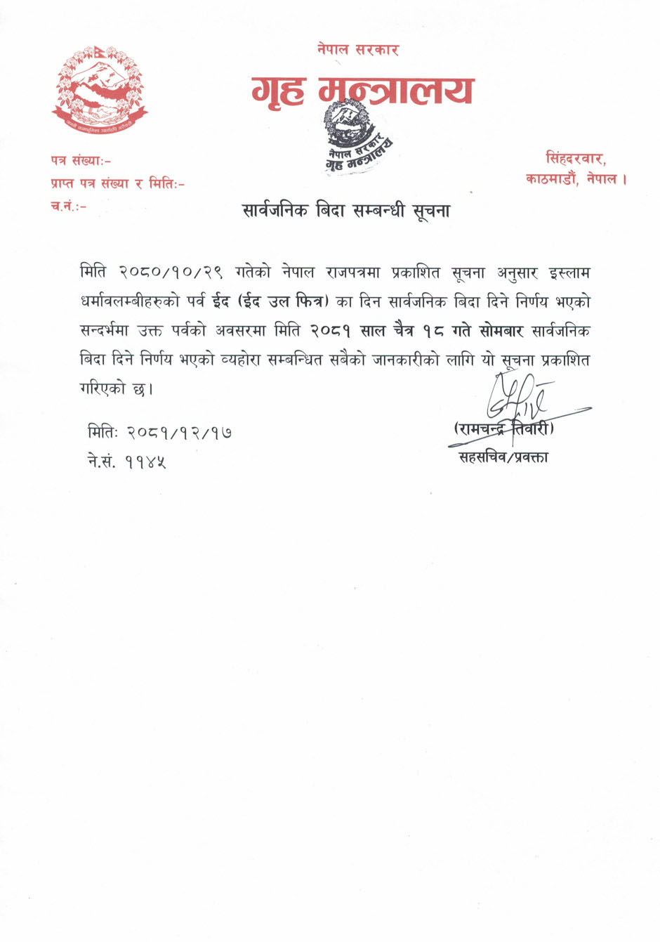 ‘२०८०/१०/२९ गतेको नेपाल राजपत्रमा प्रकाशित सूचनाअनुसार इस्लाम धर्मावलम्बीहरुको पर्व ईद (ईद उल फित्र) का दिन सार्वजनिक बिदा दिने निर्णय भएको सन्दर्भमा उक्त पर्वको अवसरमा २०८१ चैत १८ गते सोमबार सार्वजनिक बिदा दिने निर्णय भएको व्यहोरा सम्बन्धित सबैको जानकारीको लागि यो सूचना प्रकाशित गरिएको छ,’ मन्त्रालयका सहसचिव एवं प्रवक्ता रामचन्द्र तिवारीले जारी सूचनामा उल्लेख छ ।
