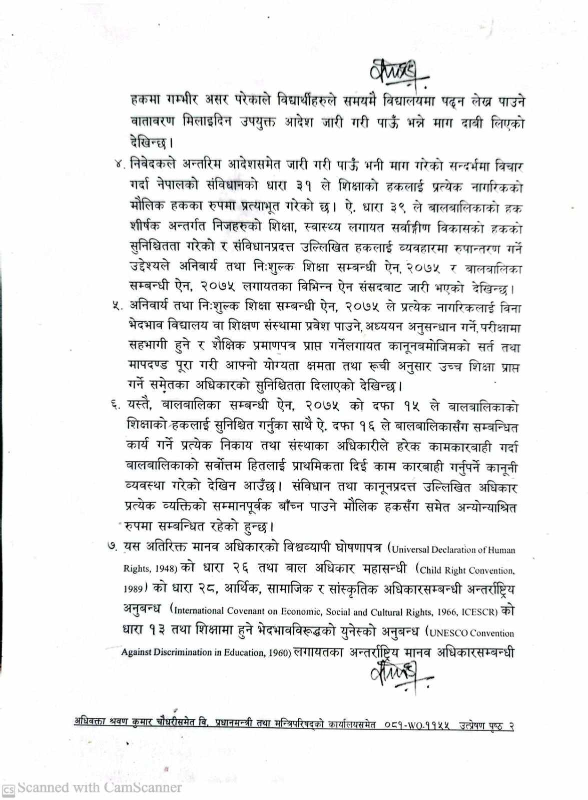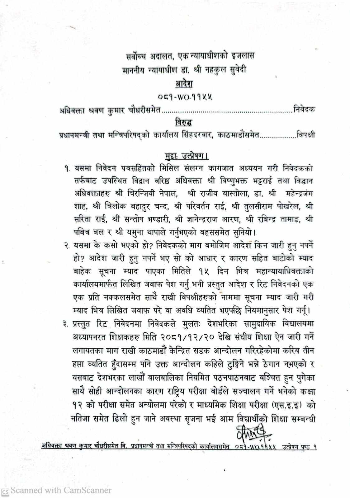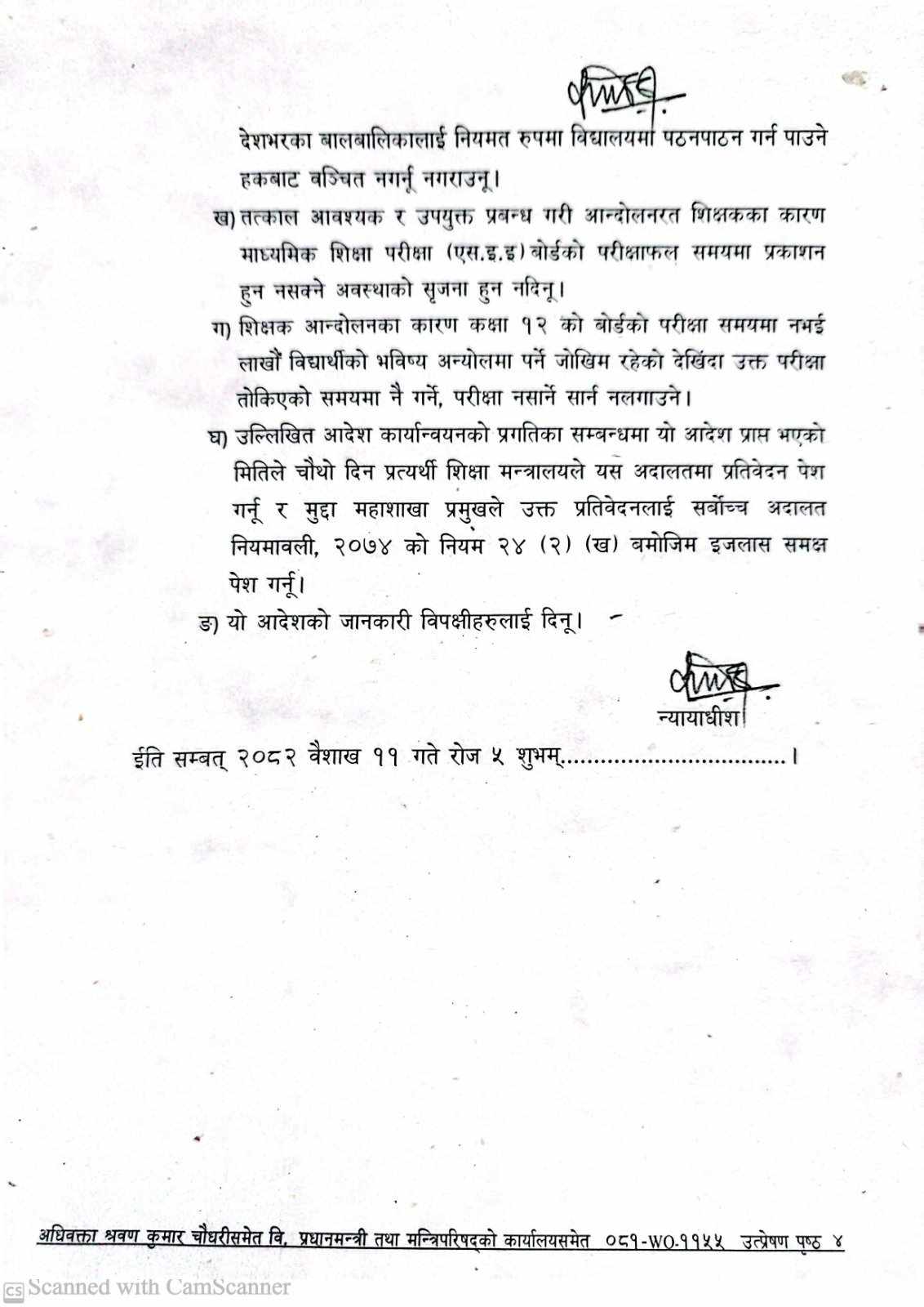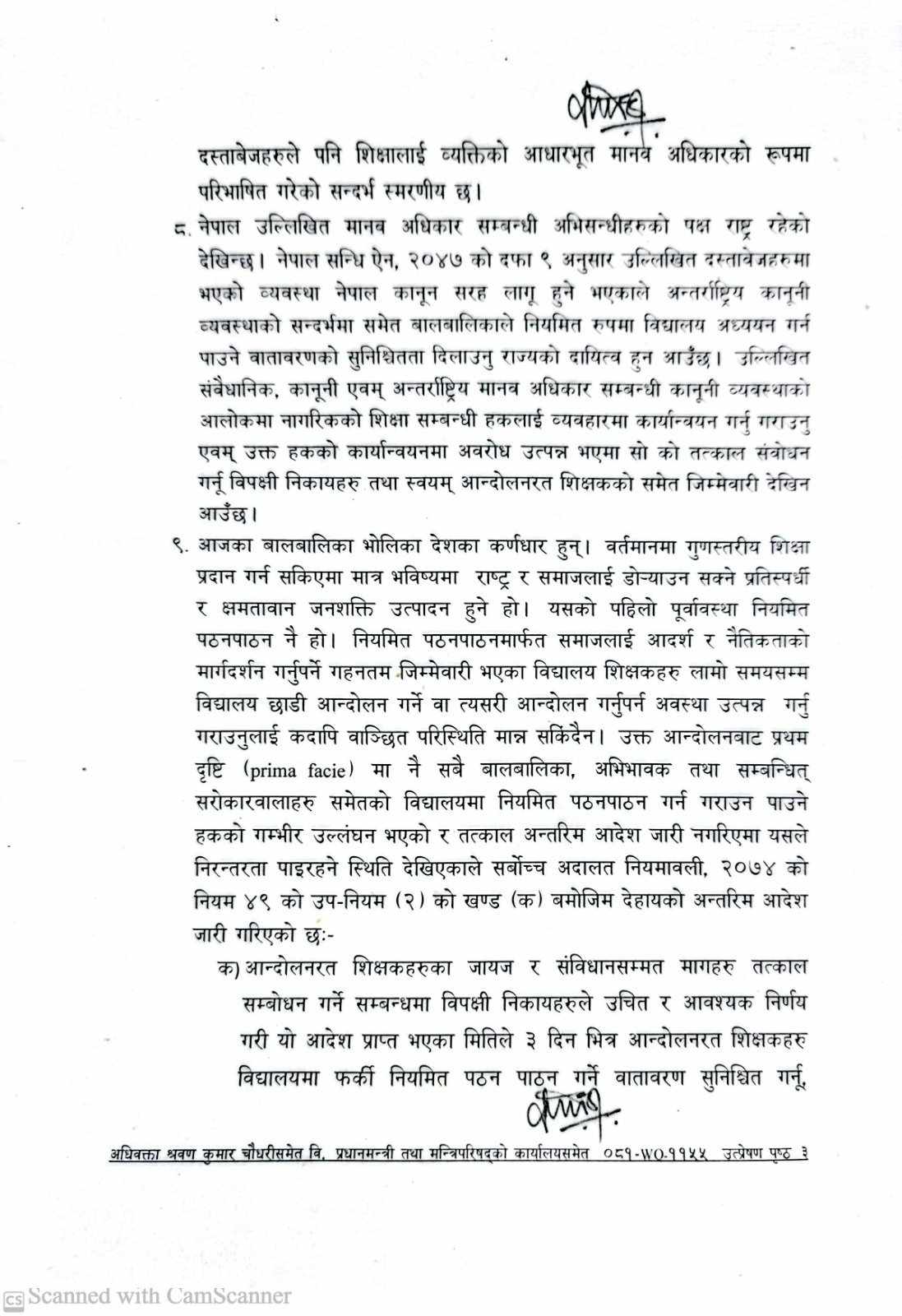 न्यायाधीश नहकुल सुवेदीको इजलासले बिहीबार यस्तो आदेश दिएको हो । ‘शिक्षकका जायज र संविधानसम्मत माग तत्काल सम्बोधन गर्ने सम्बन्धमा विपक्षी निकायहरुले उचित र आवश्यक निर्णय गरी यो आदेश प्राप्त भएका मितिले तीन दिनभित्र आन्दोलनरत शिक्षकहरु विद्यालयमा फर्की नियमित पठनपाठन गर्ने वातावरण सुनिश्चित गर्नू’ आदेशमा भनिएको छ ।