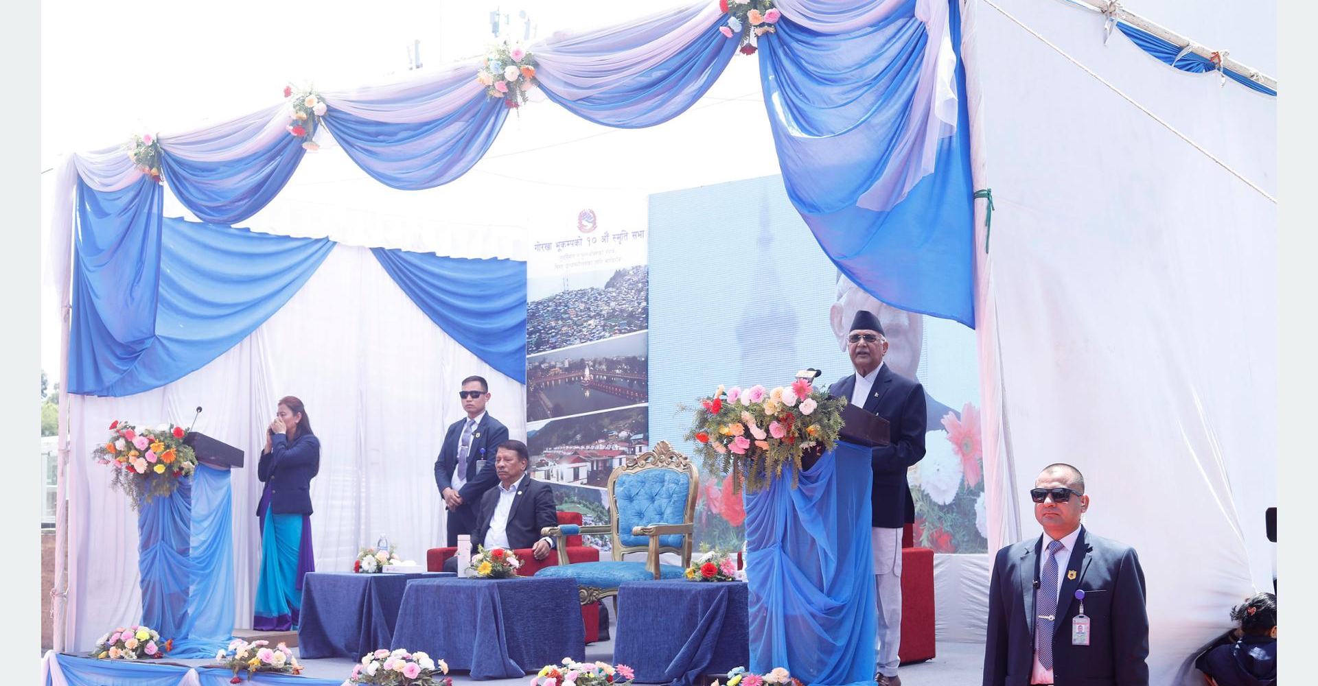 राष्ट्रिय विपद् जोखिम न्यूनीकरण तथा व्यवस्थापन प्राधिकरणद्वारा यहाँस्थित धरहरा परिसरमा आज आयोजित गोरखा भूकम्पको १०औँ स्मृतिसभामा उहाँले सुशासन र विकासका प्रश्नहरुमा पनि हाम्रो राष्ट्रिय एकताको अनिवार्य आवश्यकता औँल्याउनुभयो ।