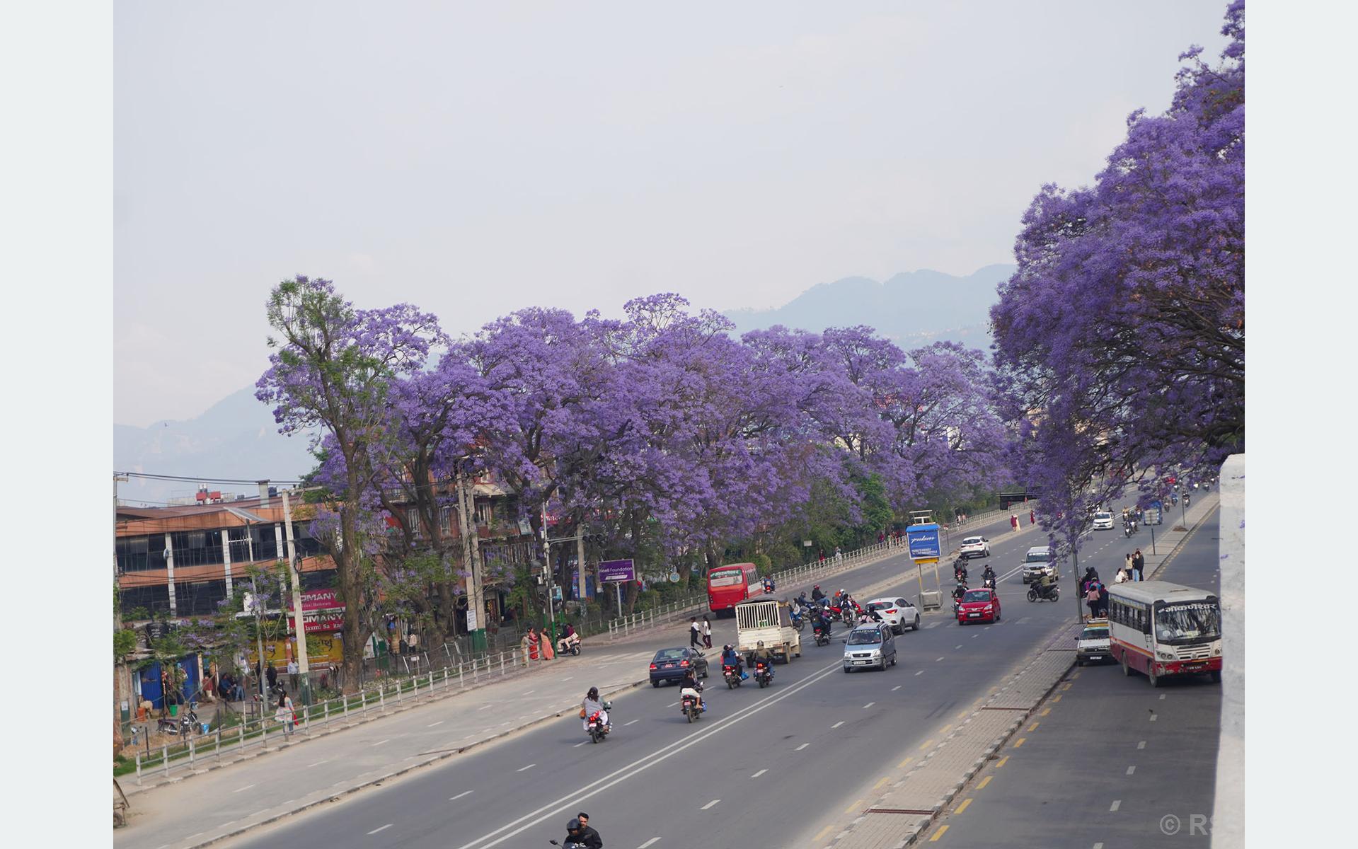 ललितपुर, २६ वैशाख: ललितपुर महानगरपालिका–१४ स्थित चक्रपथ वरपर वैजनी रङको जाकाराण्डा फूल ढपक्क फुलेको छ । वसन्त ऋतुमा फूल्ने यस फूलले यहाँको शोभा बढाएको छ । अचेल दिनहुँजसो फूल र चक्रपथलाई पृष्ठभूमिमा राखेर तस्बिर र भिडियो खिच्ने युवायुवतीको उपस्थिति झनै हेर्न लायक हुन्छ ।