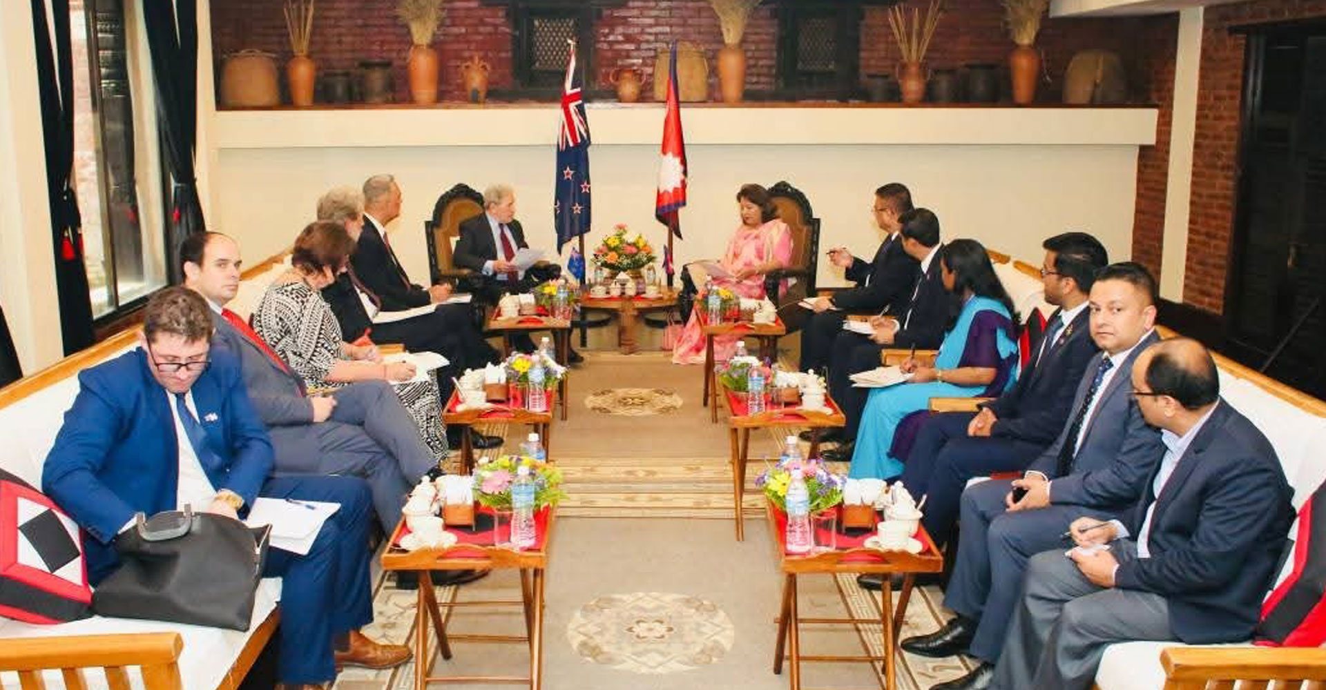 काठमाडौँ, १५ जेठः नेपाल भ्रमणमा रहनुभएका न्युजिल्यान्डका उपप्रधानमन्त्री तथा विदेशमन्त्री विन्स्टन पिटर्स र परराष्ट्रमन्त्री डा आरजु राणा देउवाबीच आज यहाँ द्विपक्षीय भेटवार्ता भएको छ ।