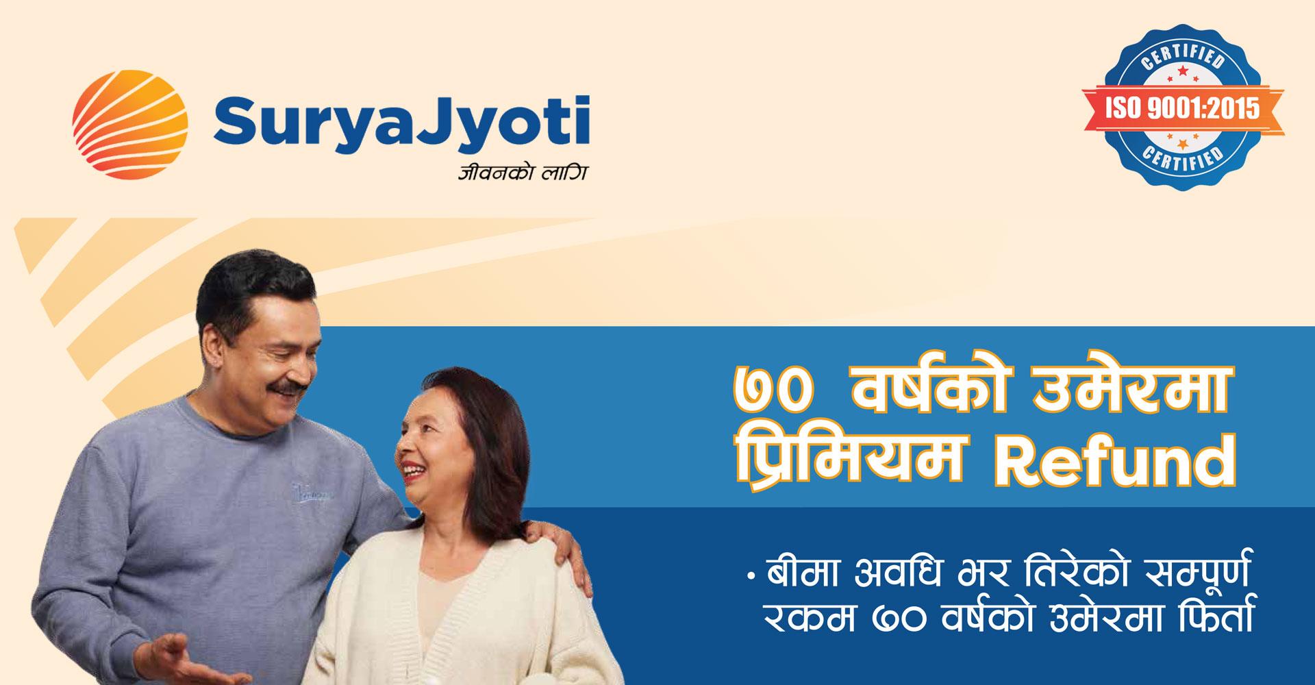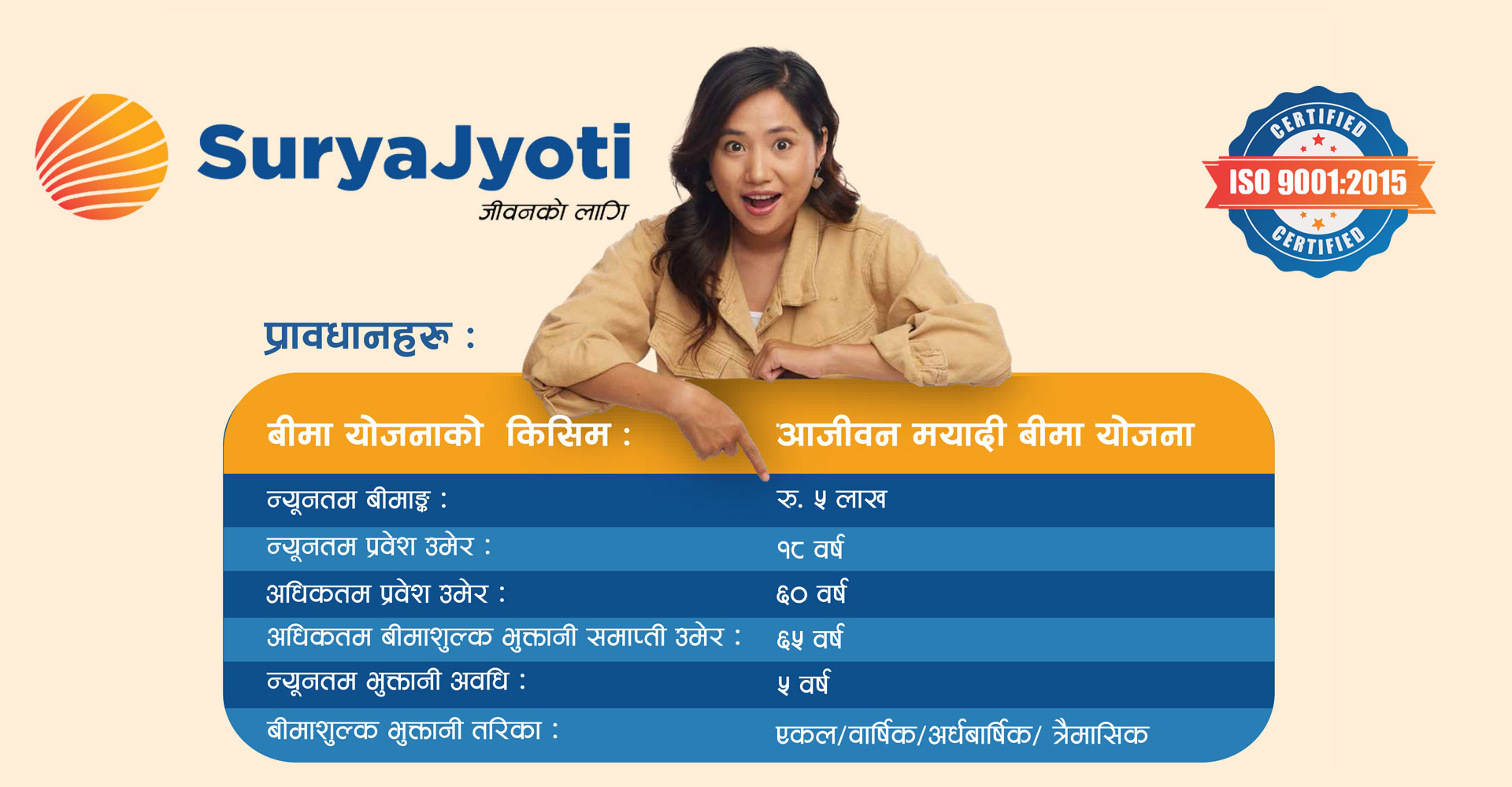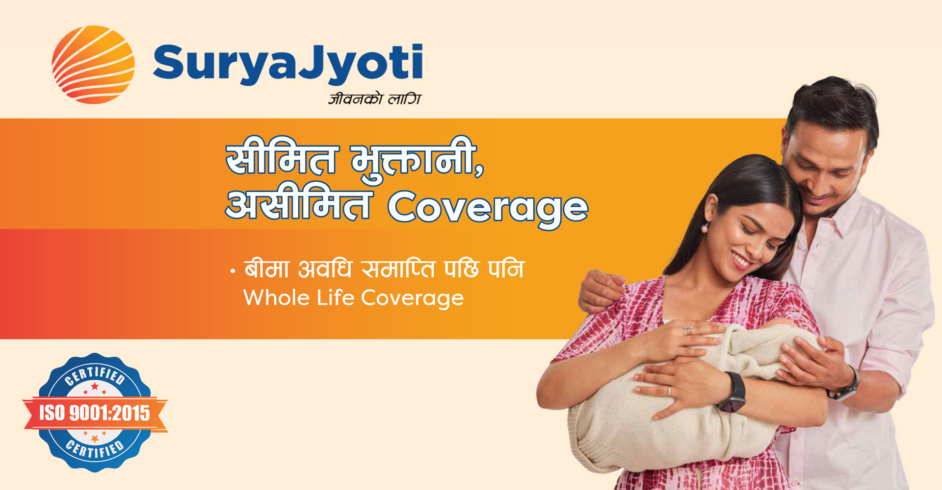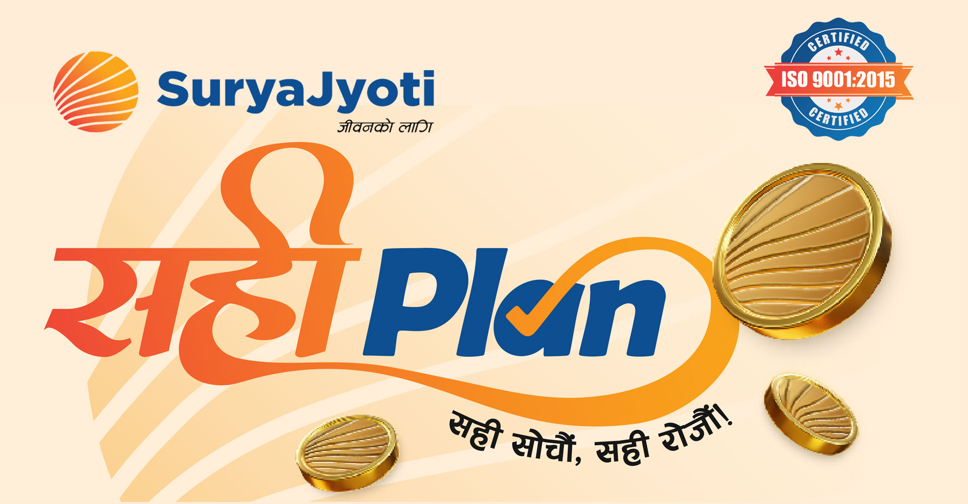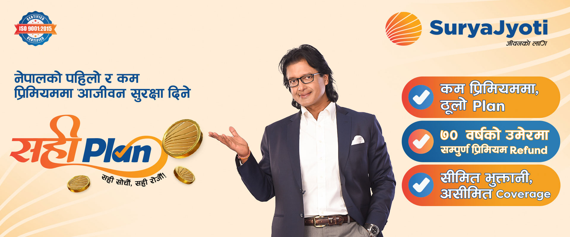 सूर्यज्योति लाइफ़ले समय सापेक्ष आफ्ना ग्राहकहरुको हित र सुबिधालाई ध्यानमा राखी नविनतम र परिस्कृत सेवा पस्किदै आईरहेको छ। नेपालको जीवन बीमा क्षेत्रमा सूर्यज्योति लाइफ इन्सोरेन्सले तिहारको अवसरपारि पहिलो पटक कम प्रिमियममा सर्बाधिक आजीवन सुरक्षा प्रदान गर्ने एक मात्र बीमा योजना ( सूर्यज्योति सही प्लान ) पस्कन सफल भएको हो। यो बीमा योजनामा अन्य जीवन बीमा कम्पनी भन्दा भिन्न र उत्कृष्ट सुबिधाहरु र बिशेषताहरु भएकोले नै “सूर्यज्योति सही प्लान” ले नेपाली जीवन बीमा बज़ारमा छिट्टैनै आफ्नो स्थान पाउनेमा कम्पनी ढुक्क रहेको छ।