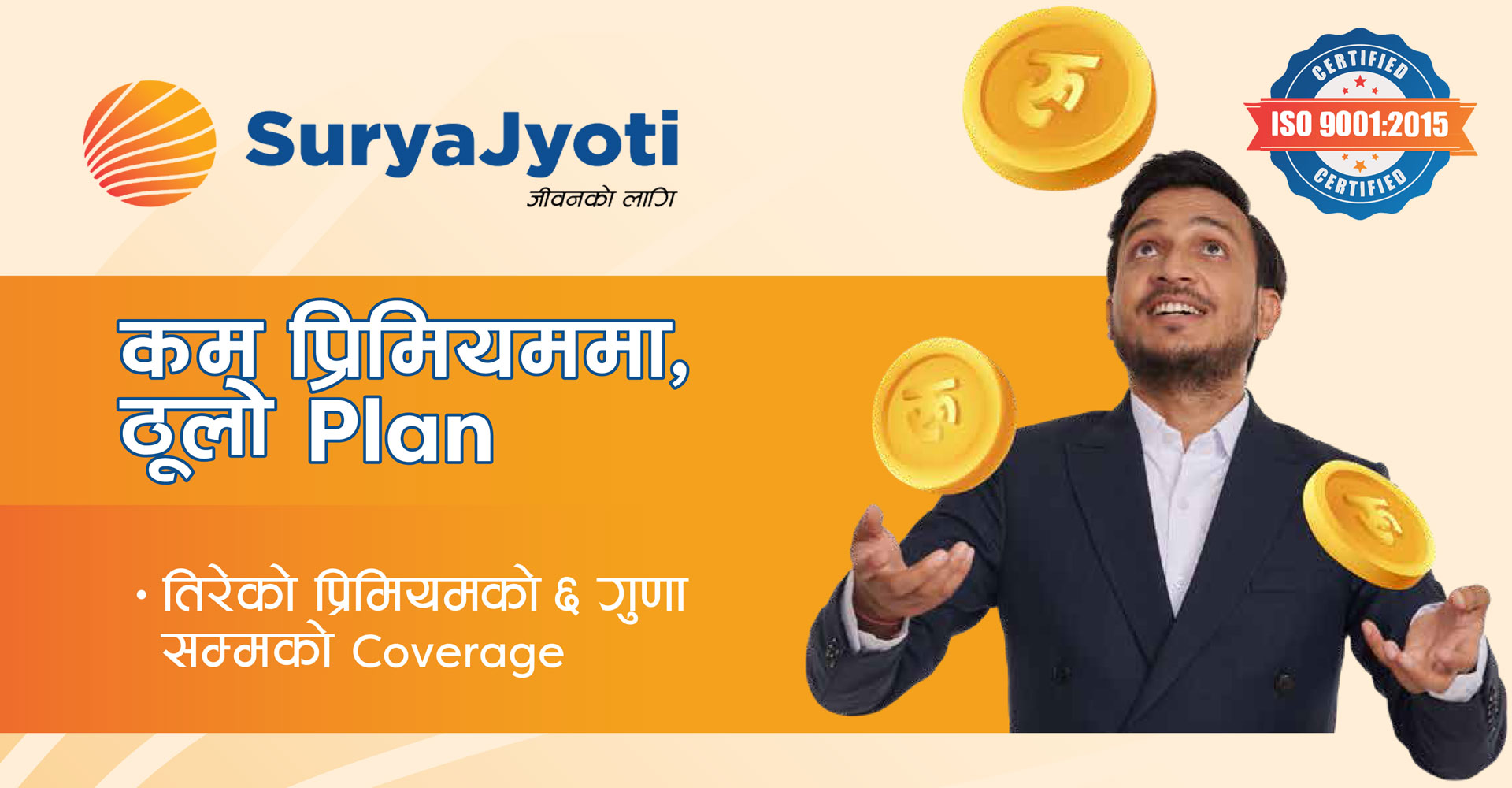यिनै प्रकारका आवश्यकताहरुलाई मध्ये नजर गरी सूर्यज्योति लाइफ़द्वारा भर्खरै ल्याईको “सूर्यज्योति सही प्लान” रोज्यौ भने तेतीनै बार्षिक रु ४० देखि ४५ हजार प्रिमियम ( उमेर अनुसार प्रिमियम दर फरक पर्न सक्छ ) मै लगभग रु २५ लाखसम्मको बीमा गर्न सक्छौ जसले तपाईको जीवनमा आई पर्न सक्ने आर्थिक जोखिमको भारमा राहत दिनसक्छ र तपाई अनि तपाईको परिवारको सुनौलो भबिस्यका लागि सहारा हुनसक्छ।