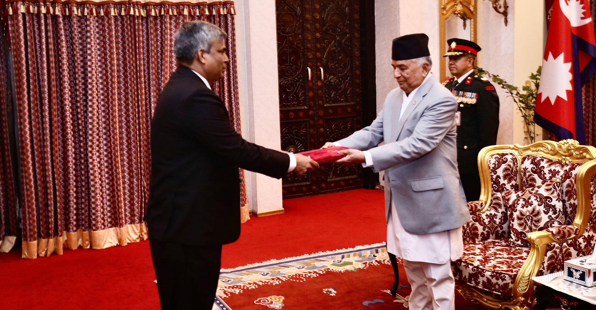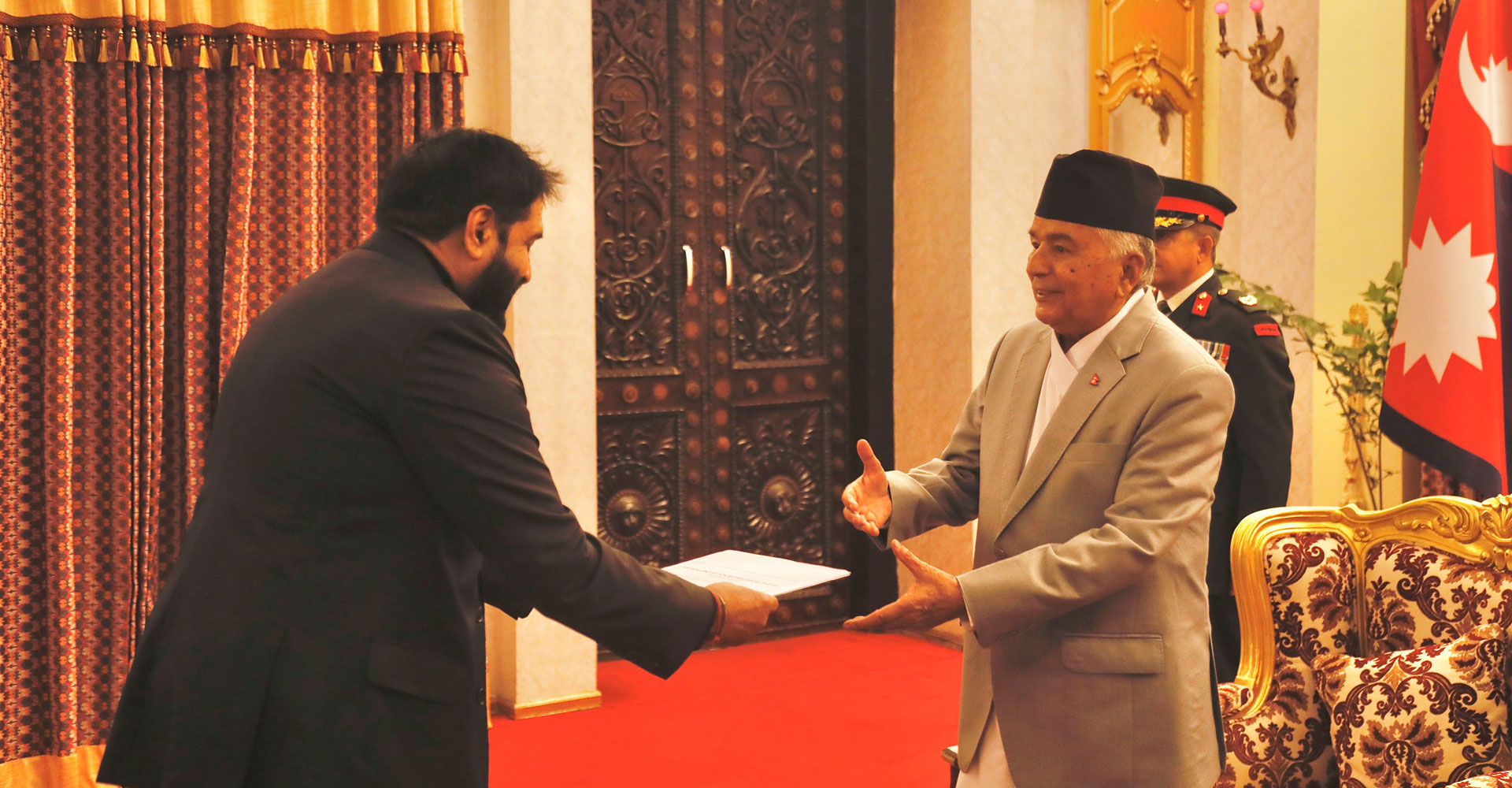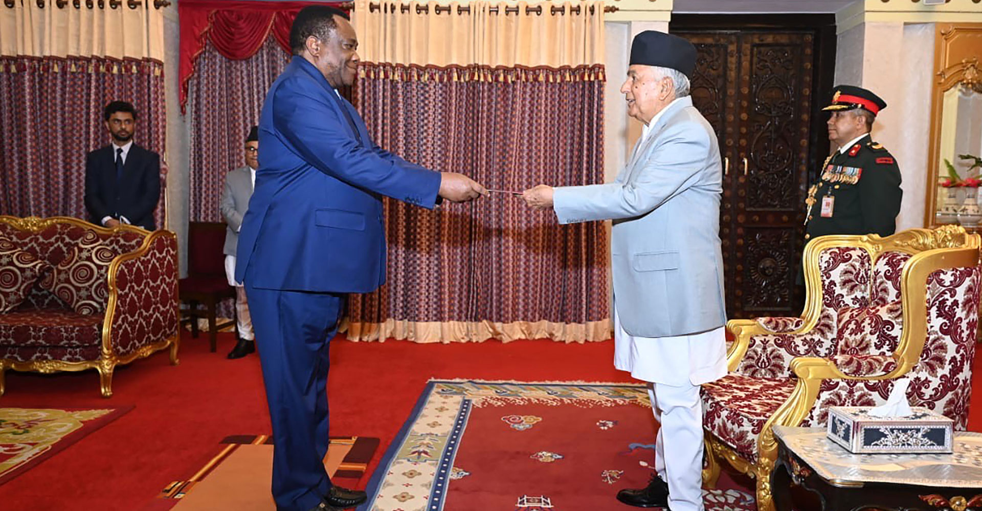 समारोहमा जनगणतन्त्र बङ्गलादेशका आवासीय राजदूत मो शाफिकुर रहमान, गणतन्त्र दक्षिण अफ्रिकाका गैरआवासीय राजदूत अनिल सूकलाल, गणतन्त्र एङ्गोलाका गैरआवासीय राजदूत क्लेमेन्टे पेड्रो फ्रान्सिस्को कामेन्ह र गणतन्त्र अर्जेन्टिनाका गैरआवासीय राजदूत मारिनो अगुस्टिनले आ–आफ्नो ओहोदाको प्रमाणपत्र पेश गर्नुभएको हो ।