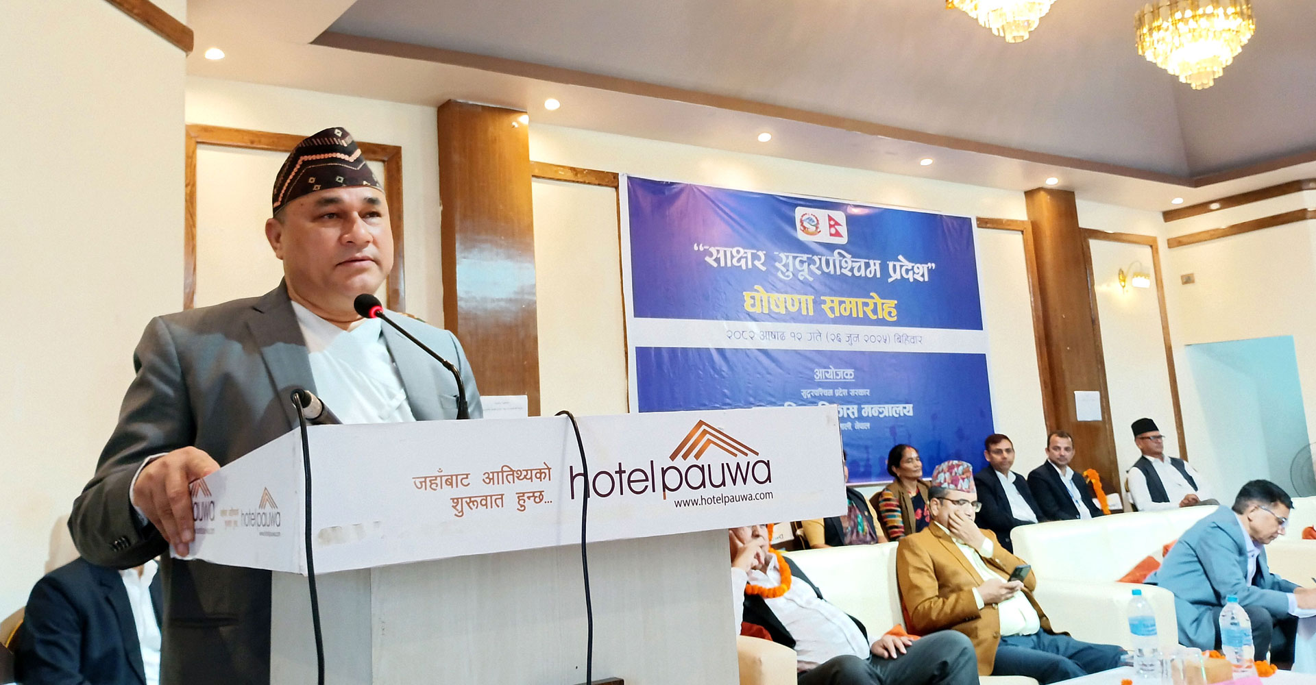 सुदूरपश्चिम, १२ असारः साक्षरताको सुनिश्चिततासँगै सुदूरपश्चिम प्रदेशलाई आज ‘साक्षर सुदूरपश्चिम प्रदेश’ घोषणा गरिएको छ । मुख्यमन्त्री कमलबहादुर शाहले आज धनगढीमा आयोजित समारोहमा साक्षर सुदूरपश्चिम प्रदेश घोषणा गर्नुभएको हो । सो अवसरमा उहाँले सूचना र प्रविधिले फड्को मारेको वर्तमान परिपे्रक्ष्यमा समयानुकूल शिक्षाको खाँचो रहेको बताउनुभयो ।
