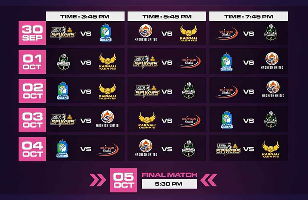 ९ असोज, काठमाडौं। ईन्फिनिटी ड्रिम्सको आयोजनामा पहिलो पटक हुन लागेको वात्सल्य एभरेष्ट महिला भलिबल लिग (ईडब्लुभिएल) को खेलतालिका सार्वजनिक भएको छ ।आइोजक ईन्फिनिटी ड्रिम्सले बुधबार प्रेस विज्ञप्ती मार्फत खेलतालिका सार्वजनिक गरेको हो । नेपाली महिला भलिबलमा पहिलो पटक हुन लागेको महिला भलिबलको फ्रेन्चाईज लिग यही असोज १४ देखि १९ गते (सेप्टेम्बर३० देखि अक्टोबर ५) सम्म हुँदैछ ।