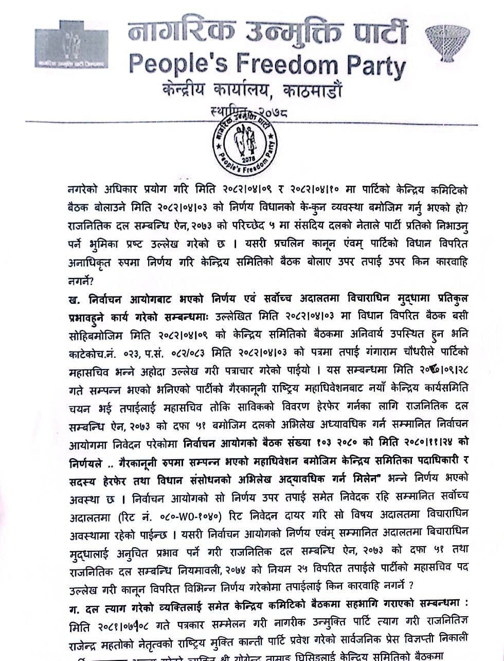 १५ साउन, काठमाडौं : नागरिक उन्मुक्ति पार्टीको विवाद चर्किँदै गएको अवस्थामा अध्यक्ष तथा सांसद रञ्जिता श्रेष्ठले संसदीय दलका नेता गंगाराम चौधरीलाई स्पष्टिकरण सोधेकी छन् । पार्टी हितविपरीत, विधान र राजनीतिक दलसम्बन्धी ऐनका प्रावधानविपरीत कार्य गरेकाले कारबाही किन नगर्ने ? भने अध्यक्ष श्रेष्ठले दलका नेता चौधरीलाई स्पष्टीकरण सोधेकी हुन् ।