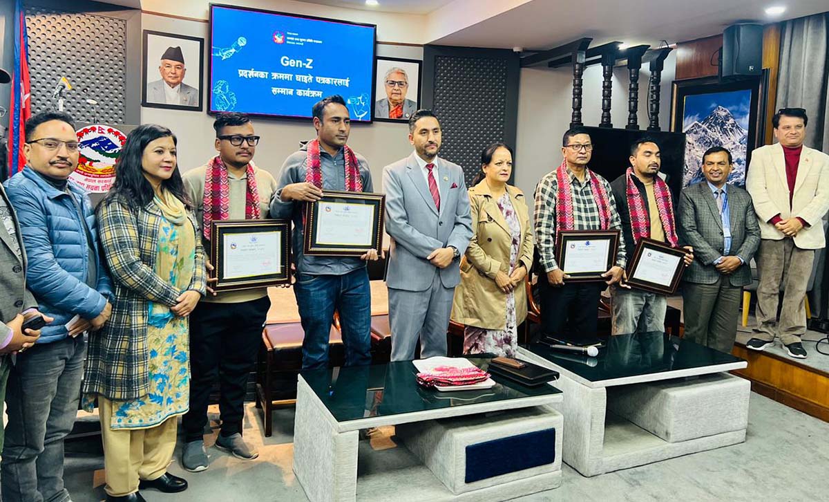जेन-जी प्रदर्शनको क्रममा प्रहरीले प्रहार गरेको छर्रा र रबरको गोली लागेर चार जना पत्रकार घाइते भएका छन् । आन्दोलनको क्रममा घाइते भएका कान्तिपुर टेलिभिजनका भिडियो पत्रकार श्याम श्रेष्ठ, नयाँ पत्रिका दैनिकका फोटो पत्रकार दीपेन्द्र ढुंगाना, नेपाल प्रेसडटकमका फोटो पत्रकार उमेश कार्की र पत्रकार शम्भु दंगाललाई शुक्रबार मन्त्रालयमा एक कार्यक्रमका बीच सम्मान गरिएको हो । सम्मान कार्यक्रममा बोल्दै मन्त्री खरेलले घाइते पत्रकारहरुलाई निरन्तर सम्पर्कमा रहन आग्रह समेत गर्नुभयो ।