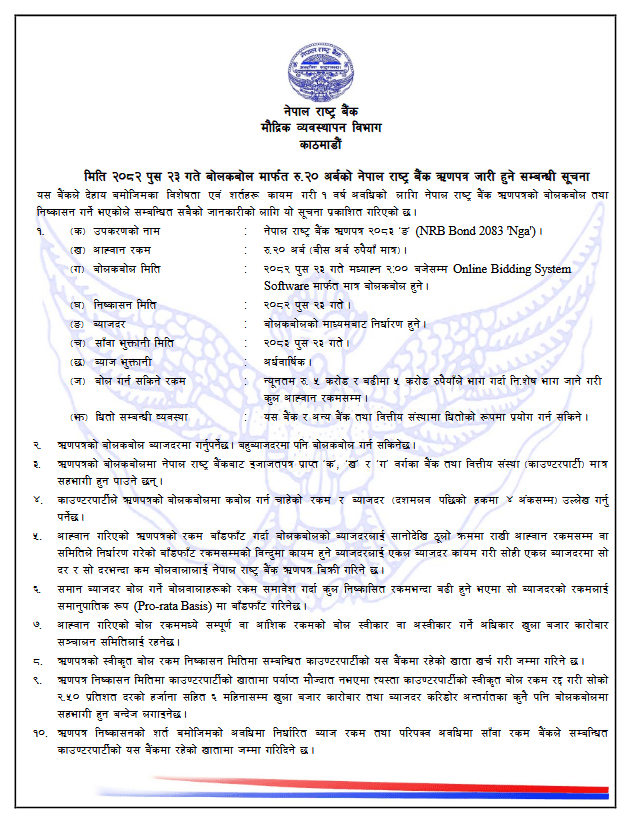 राष्ट्र बैंकले ‘नेपाल राष्ट्र बैंक ऋणपत्र–२०८३ ‘ङ’ उपकरण प्रयोग गरी ऋणपत्र निष्कासन गर्न लागेको हो ।