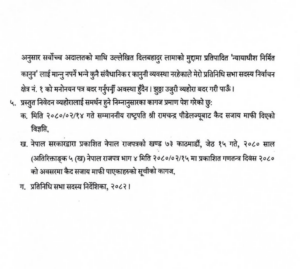 काठमाडौँ, माघ ८ गते । नागरिक उन्मुक्ति पार्टीका तर्फबाट कैलाली निर्वाचन क्षेत्र नम्बर १ का उम्मेदवार रेशम चौधरीले आफ्नो उम्मेदवारीलाई लिएर दर्ता भएको उजुरीको सन्दर्भमा लिखित स्पष्टीकरण बुझाएका छन्।