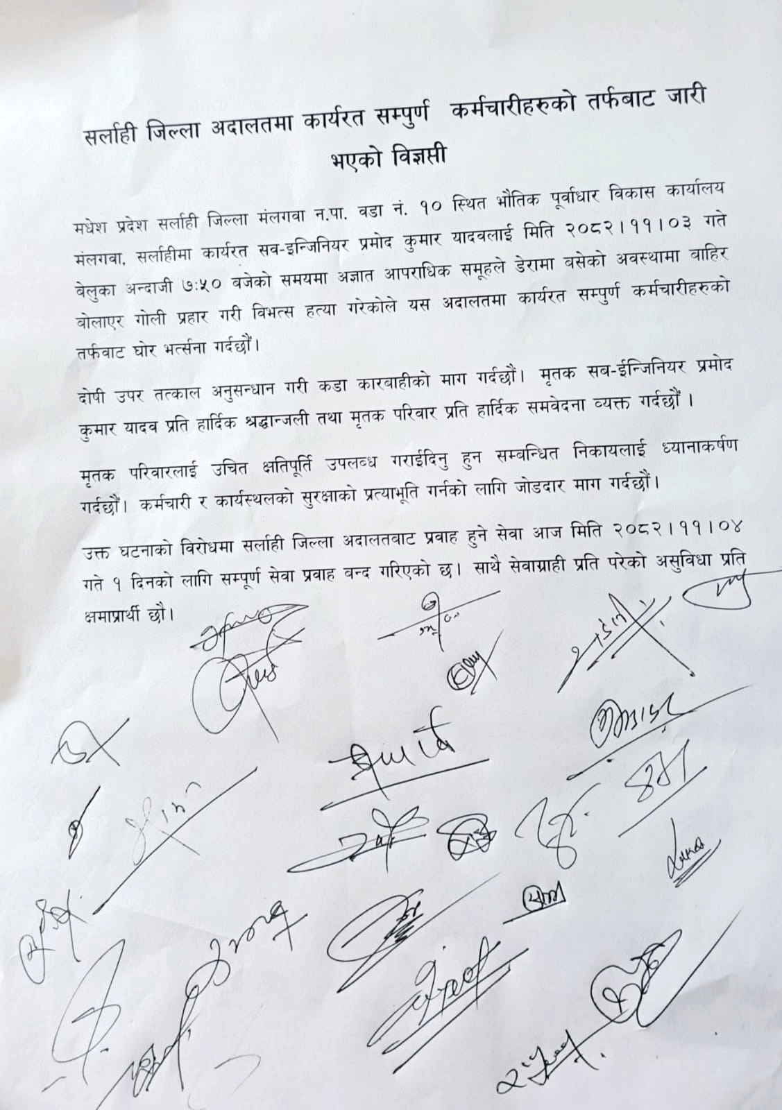 सर्लाही, फागुन ४ गते। सर्लाही जिल्ला अदालतमा कार्यरत कर्मचारीहरूले सब–इन्जिनियर प्रमोद कुमार यादवको गोली प्रहारबाट भएको हत्याको विरोध गर्दै सोमबार एक दिनका लागि अदालतको सम्पूर्ण सेवा स्वस्फूर्त रूपमा बन्द गर्ने निर्णय गरेका छन्।