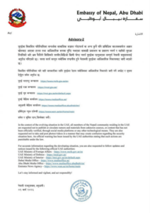 अपीलमा भनिएको छ, ‘युएईमा रहेका सम्पूर्ण नेपाली समुदायलाई यस्तो कार्य नगर्न अनुरोध गरिएको छ। यस्ता कार्य कानूनबमोजिम दण्डनीय हुने चेतावनी युएईका आधिकारिक निकायबाट जारी भएको छ।’