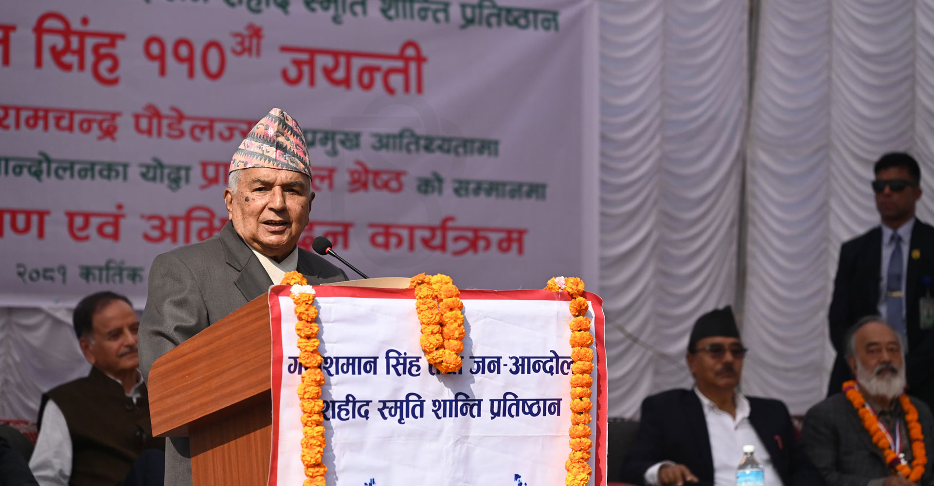 २४ कात्तिक, काठमाडौं । राष्ट्रपति रामचन्द्र पौडेलले मुलुकको सांस्कृतिक, सामाजिक एवं आर्थिक विकासका लागि सरकार र राजनीतिक दलहरुबीच सहकार्य हुनुपर्नेमा जोड दिनुभएको छ । गणेशमान सिंहको ११०औँ जन्मजयन्तीका अवसर आज यहाँ आयोजित कार्यक्रममा उहाँले सुशासन र आर्थिक विकासका माध्यमबाट सरकार र राजनीति दलप्रति नागरिकको विश्वास बढाउनुपर्ने बताउनुभयो ।