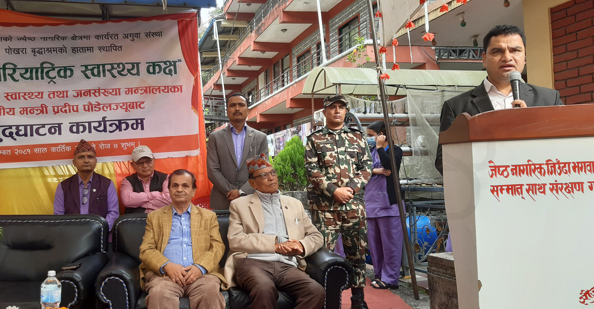 पोखरामा वृद्धाश्रममा सञ्चालित जेरियाट्रिक स्वास्थ्य कक्षमा आवश्यक स्वास्थ्य उपकरण एवम् औषधीका लागि सहयोग गर्ने उहाँले विश्वास व्यक्त गर्नुुभयो । पोखरा वृद्धाश्रमका अध्यक्ष कुशुमकेशव पराजुलीले वृद्धाश्रम सञ्चालन भएयता निरन्तर रुपमा असहाय ज्येष्ठ नागरिकलाई सेवा प्रवाह गरिएको बताउनुुभयो ।