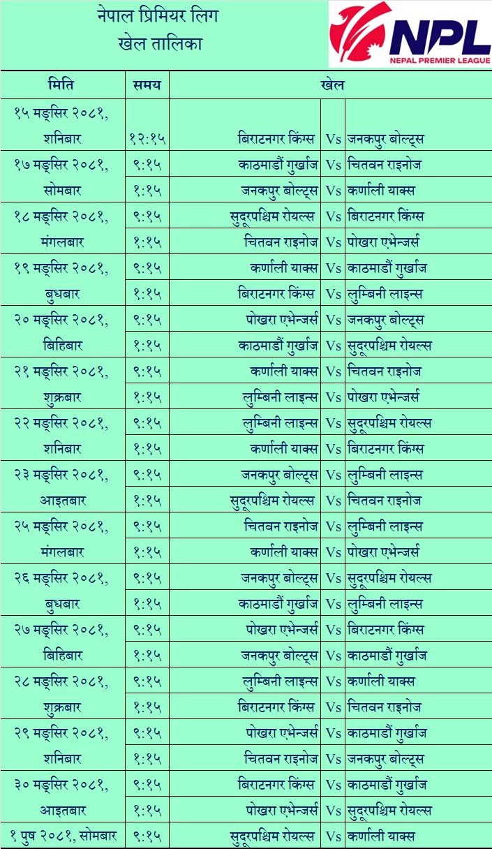 ४ मंसिर, काठमाडौं । नेपाल क्रिकेट एसोसियसन (क्यान) ले २०८१ मङ्सिर ३ गते सोमबार नेपाल प्रिमियर लिग (एनपीयल) को खेल तालिका सार्वजनिक गरेको छ ।