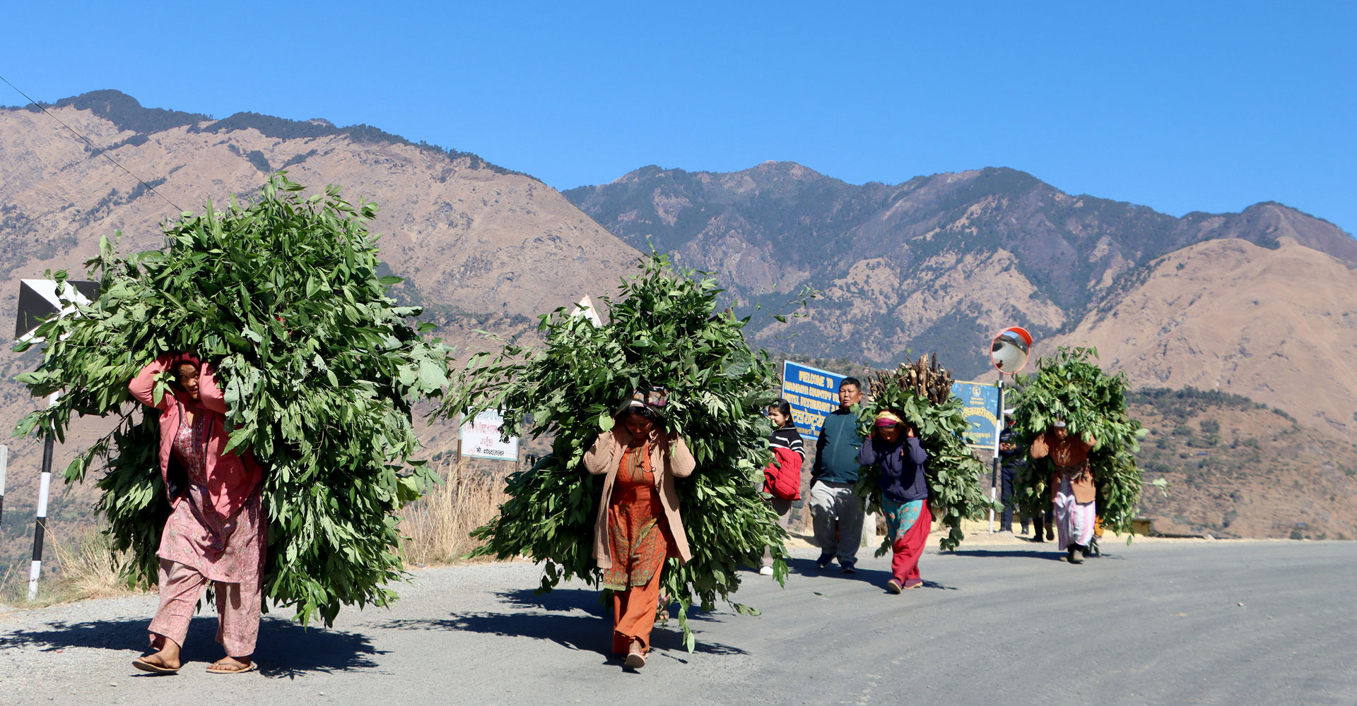 रुकुम पूर्वको सिस्ने गाउँपालिका-५ का महिला नजिकैको जङ्गलबाट घाँस लिएर घर फर्कँदै