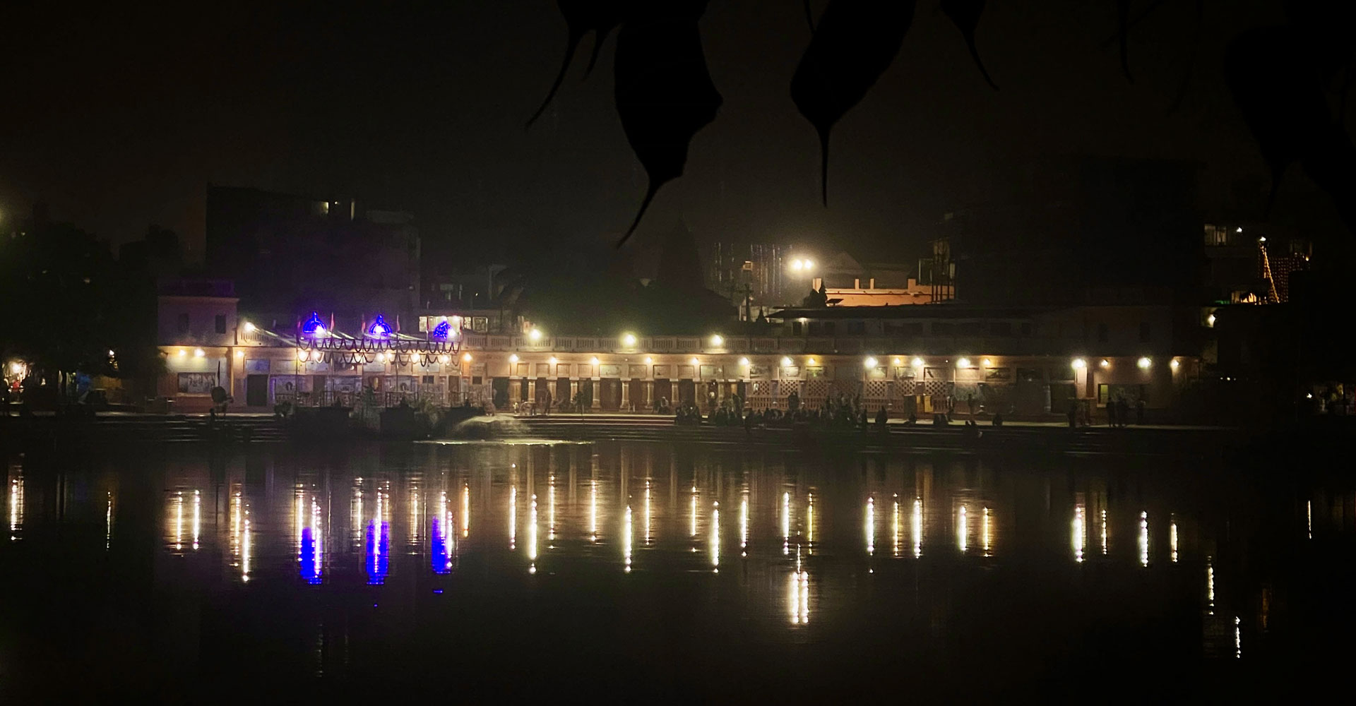 धनुषाको जनकपुरधामस्थित पवित्र गङ्गा सागर आरती घाटको सन्ध्याकालिन दृश्य। यहाँ साँझमा दैनिक हुने आरतीमा पर्यटकहरू सहभागी हुन्छन्
