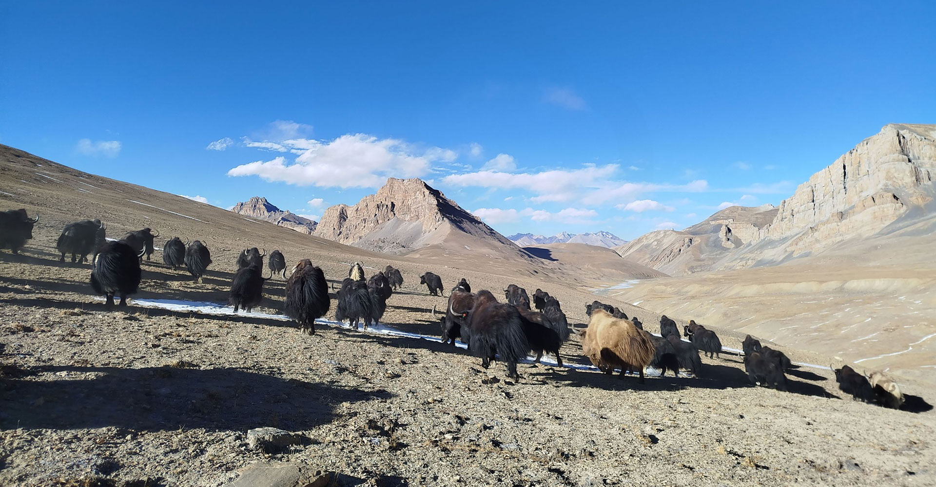 डोल्पाको शे-फोक्सुण्डो गाउँपालिका–४ नाम्दो थामवनको चरन क्षेत्रमा चर्दै गरेका चौँरीहरु । हिमाली क्षेत्रमा ढुवानी गर्ने मुख्य यातायातका साधनका रूपमा चौँरीको प्रयोग गर्ने गरेको पाइन्छ