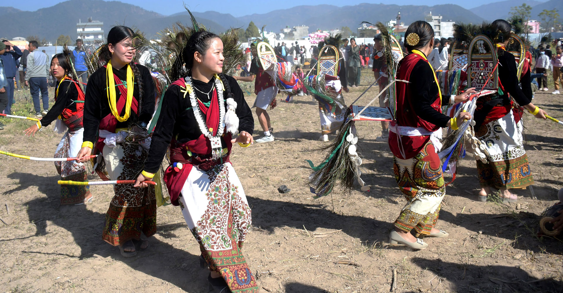 दाङको घोराही उपमहानगरपालिका–१४ स्थित झिङौरामा नेपाल मगर सङ्घ घोराहीको आयोजनामा सुरु भएको प्रथम पर्यटन तथा सांस्कृतिक प्रदर्शनी माघे मेला–२०८१ को उद्घाटन सत्रमा हिजो शनिबार सेरिङ्गे नृत्य प्रस्तुत गर्दै घोराहीका स्थानीय मगर कलाकार । पश्चिम नेपालमा विशेष उत्साहका साथ बासुरी र मादलको तालमा नाचिने सेरिङ्गे नाचलाई मयूर नाच पनि भनिन्छ