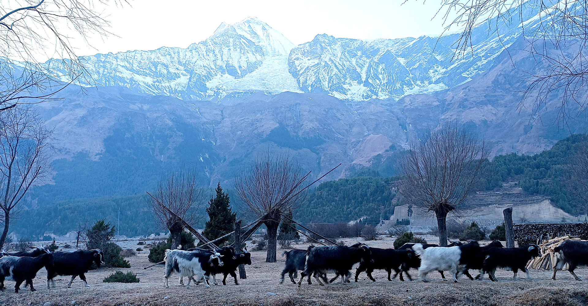 मुस्ताङको थासाङ गाउँपालिका-२ सिर्कुङ गाउँस्थित कालीगण्डकी बगरमा चर्दै गरेका भेडाच्याङ्ग्रा । कृषकहरु हिउँदेयाममा चरनको अभावमा कालीगण्डकी नदी किनारमा पाइने मुसीकाँडालाई गाइबस्तु र भेडाच्याङ्ग्राको घाँसको रुपमा प्रयोग गर्ने गर्छन्