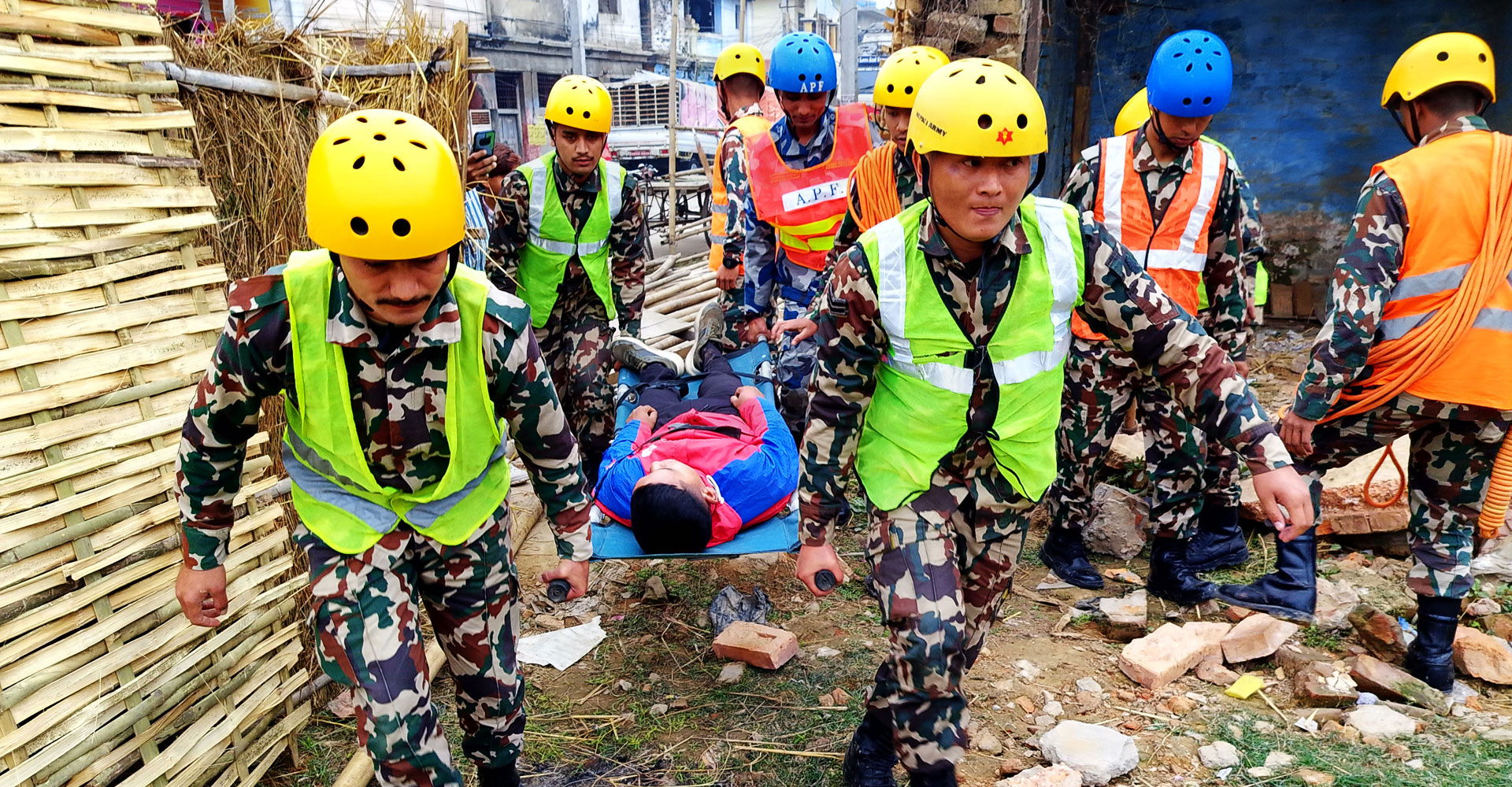 २७औँ भुकम्प सुरक्षा दिवसका अवसरमा महोत्तरीको जलेश्वर नगरपालिका–२ मा भुकम्पको समयमा गरिने सुरक्षा तथा उद्धार कार्यको नमुना अभ्यास गर्दै सुरक्षाकर्मी
