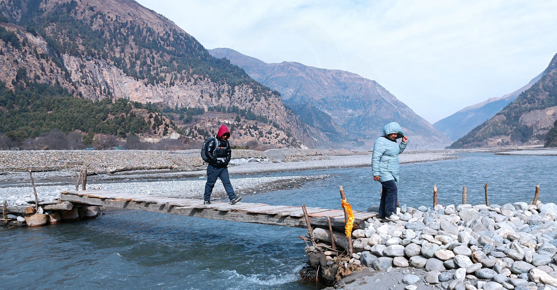 हिमाल पारिको जिल्ला मुस्ताङको थासाङ गाउँपालिका–२ कालीगण्डकी नदीमाथि जोखिम मोलेर काठेपुल तर्दै स्थानीयवासी। यस भेगका करिब आधादर्जन बढी गाउँका स्थानीय यहाँ पक्कीपुल नबन्दा दशकौंदेखि साँघु तर्न बाध्य छन्
