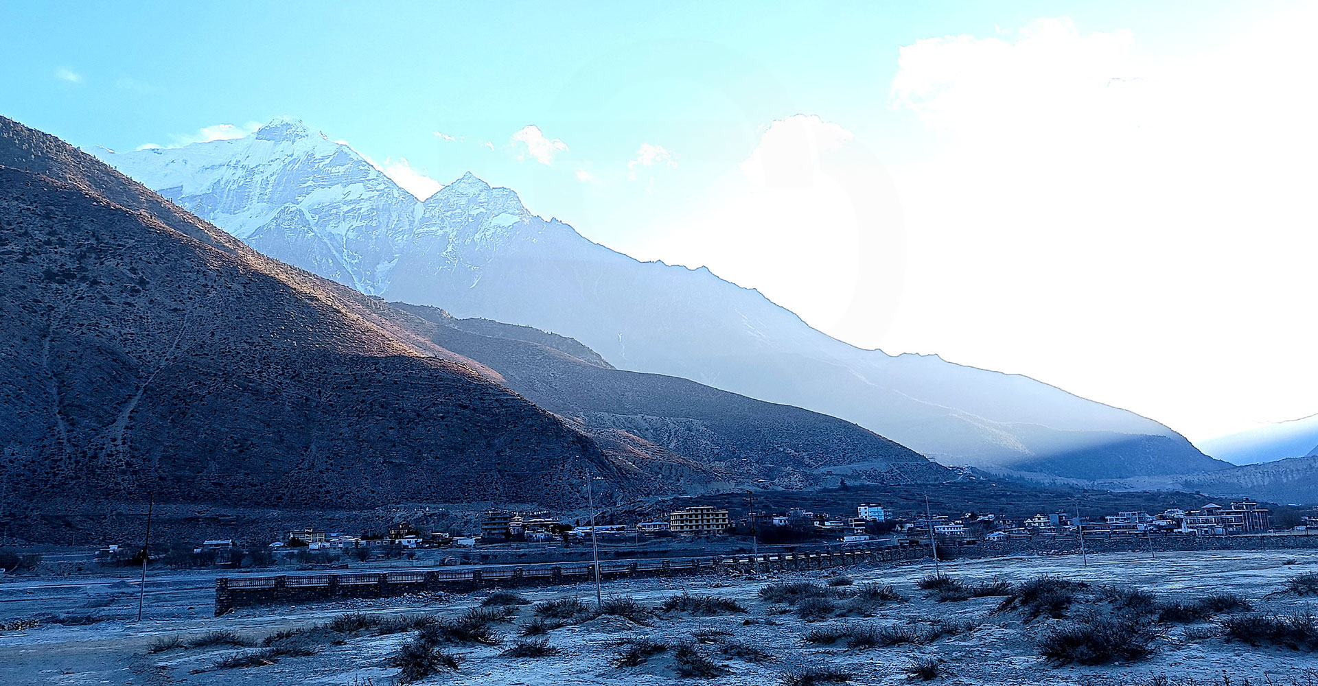 मुस्ताङको घरपझोङ गाउँपालिका-४ स्थित कालीगण्डकी नदी किनारबाट देखिएको जोमसोम बजार र पृष्ठभूमिमा निलगिरि हिमाल