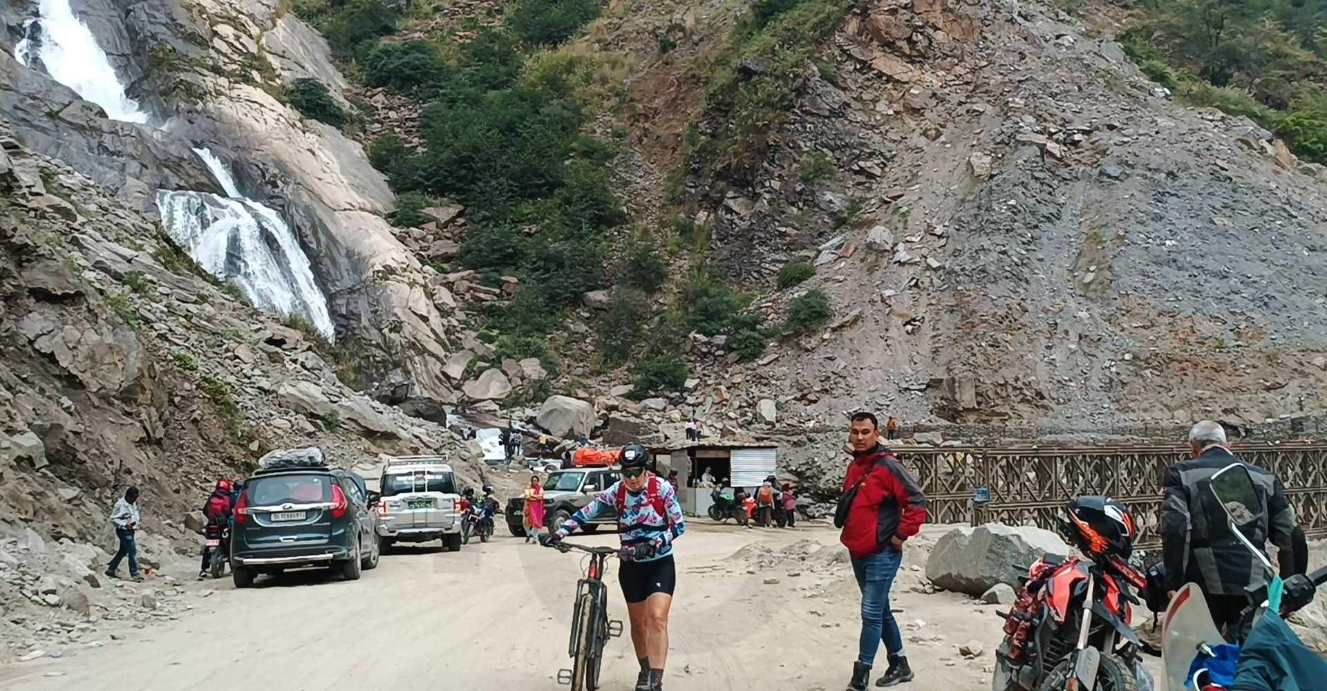 बेनी–जोमसोम कोरोला सडक खण्डमा पर्ने पर्यटकीयस्थल रुप्से झरनामा निर्माण भएको बेलिब्रिज र रुप्से झरनाको सुन्दर दृश्य