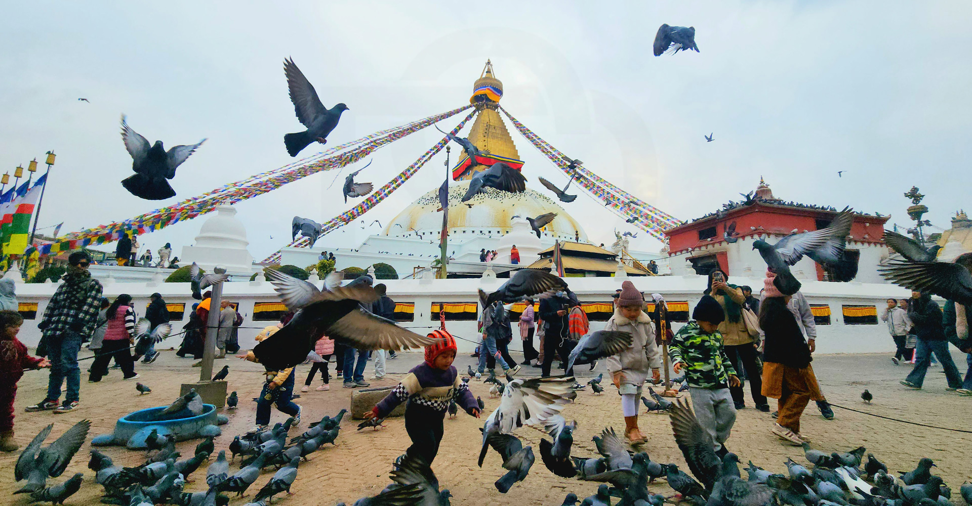 काठमाडौँको बौद्धस्थित विश्व सम्पदामा सूचीकृत बौद्धनाथ स्तूपमा परेवासँग रमाउँदै बालक