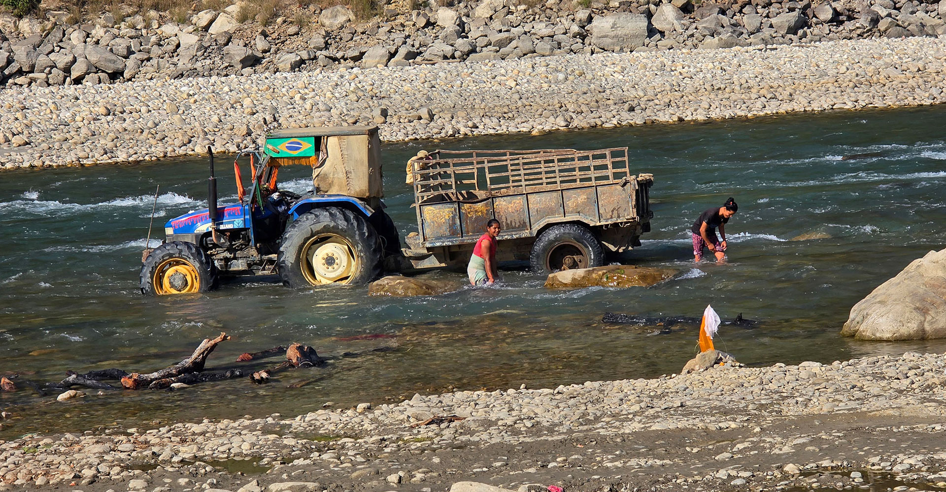 सुर्खेतको भेरीगङ्गा नगरपालिका–२ सत्तरीस्थित भेरी नदीबाट बालुवा निकालेर ट्याक्टरमा लोड गर्दै स्थानीय महिलाहरु । विगतमा डोजरको प्रयोग गरेर ढुङ्गा निकाल्ने गरेकामा आजभोलि डोजरको प्रयोगमा रोक लगाएपछि स्थानीयहरुले रोजगारी पाएको यहाँका स्थानीयहरु बताउँछन्