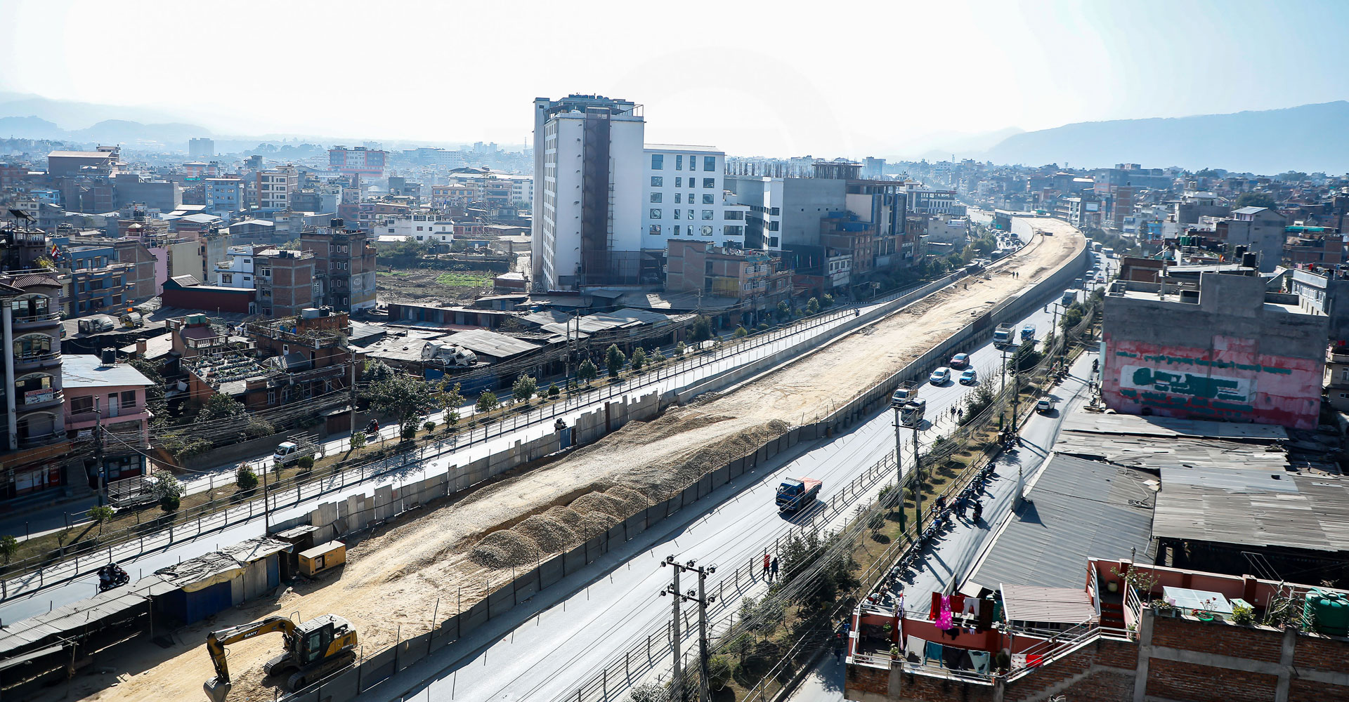 ललितपुरको ग्वार्कोमा निर्माणाधीन फ्लाइ ओभर । चक्रपथ विस्तार आयोजनाअन्तर्गत विस्तारित सडक खण्डको ग्वार्को चोकमा १७ करोड ३७ लाख रुपैयाँ लगानीमा फ्लाइओभर निर्माण कार्यलाई तीव्रता दिइएको हो
