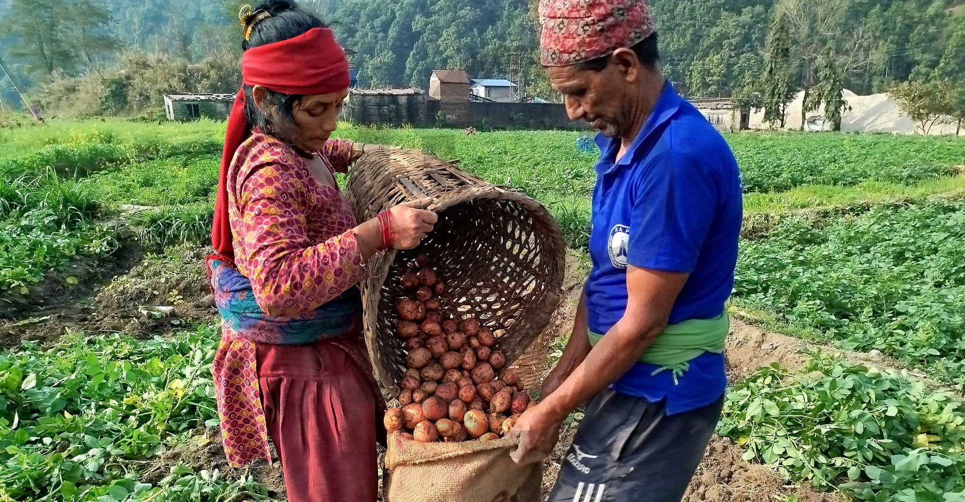 मकवानपुरगढी गाउँपालिका-५ सामरीमा आलु खन्दै किसान । मकवानपुरको सामरी आलुखेतीका लागि राम्रो मानिन्छ