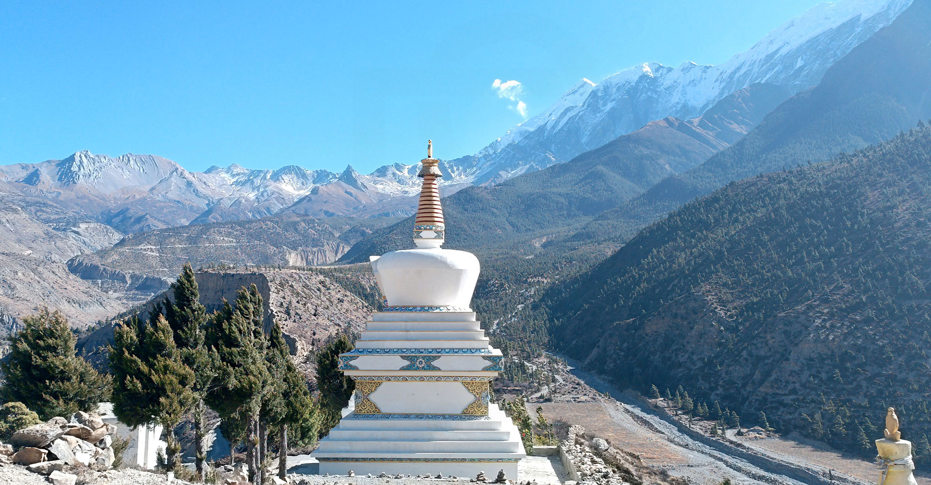 मुस्ताङको घरपझोङ गाउँपालिका-५ ढुम्बामा रहेको बोधी स्तुप र पृष्ठभूमिमा तिलोचो हिमाल