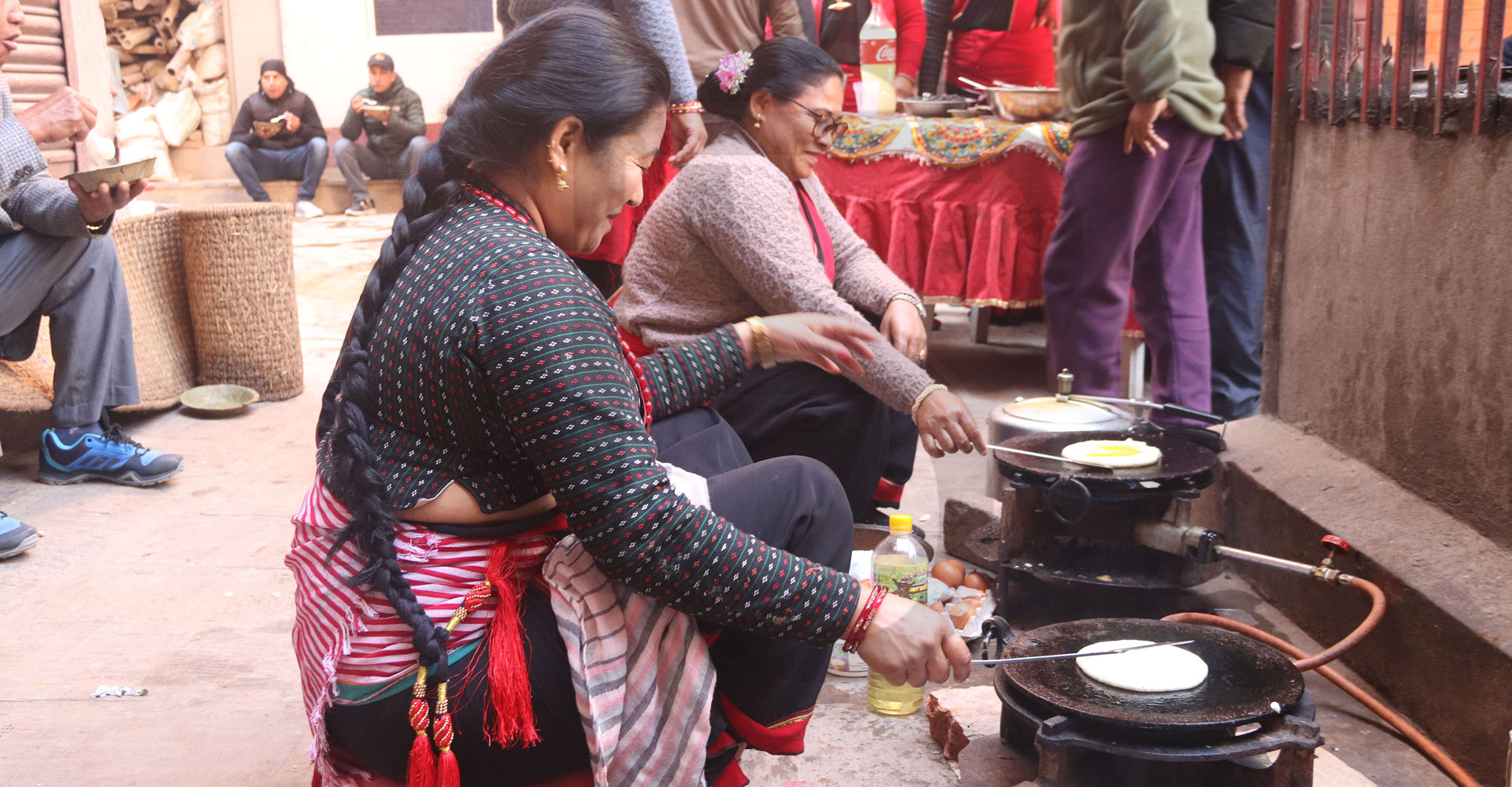 काठमाडौँको टोखामा नेवाः देय् दबू टोखा नगर समितिले बुधबार टोखामा आयोजना गरेको १५औँ नेवाः एकता दिवस कार्यक्रममा नेवारी खाजा स्टलमा विभिन्न परिकार पकाउँदै टोखाका स्थानीय महिला