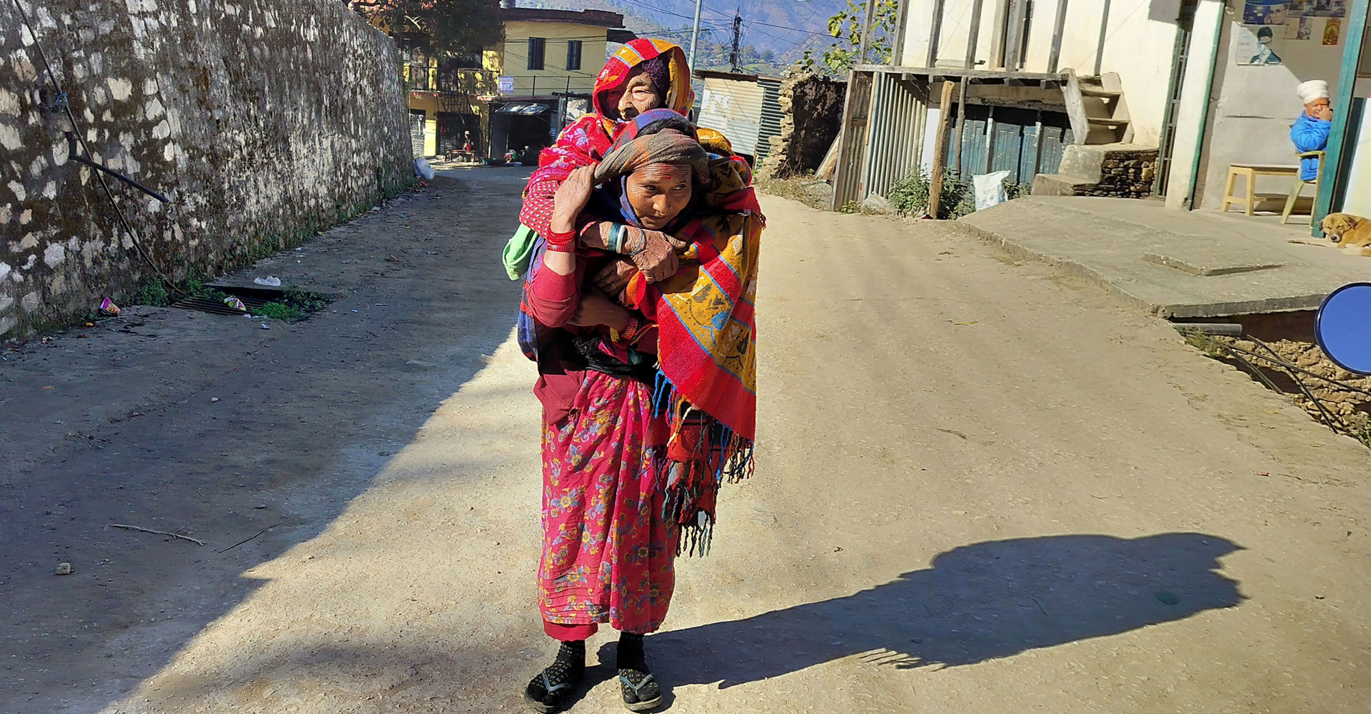 अछामको मङ्गलसेन नगरपालिका–३, ओखरतोलाका ६० वर्षीया कोकिला ढोली आफ्नो ८३ वर्षकी आमालाई उपचारपश्चात् बोकेर घर लैजाँदै
