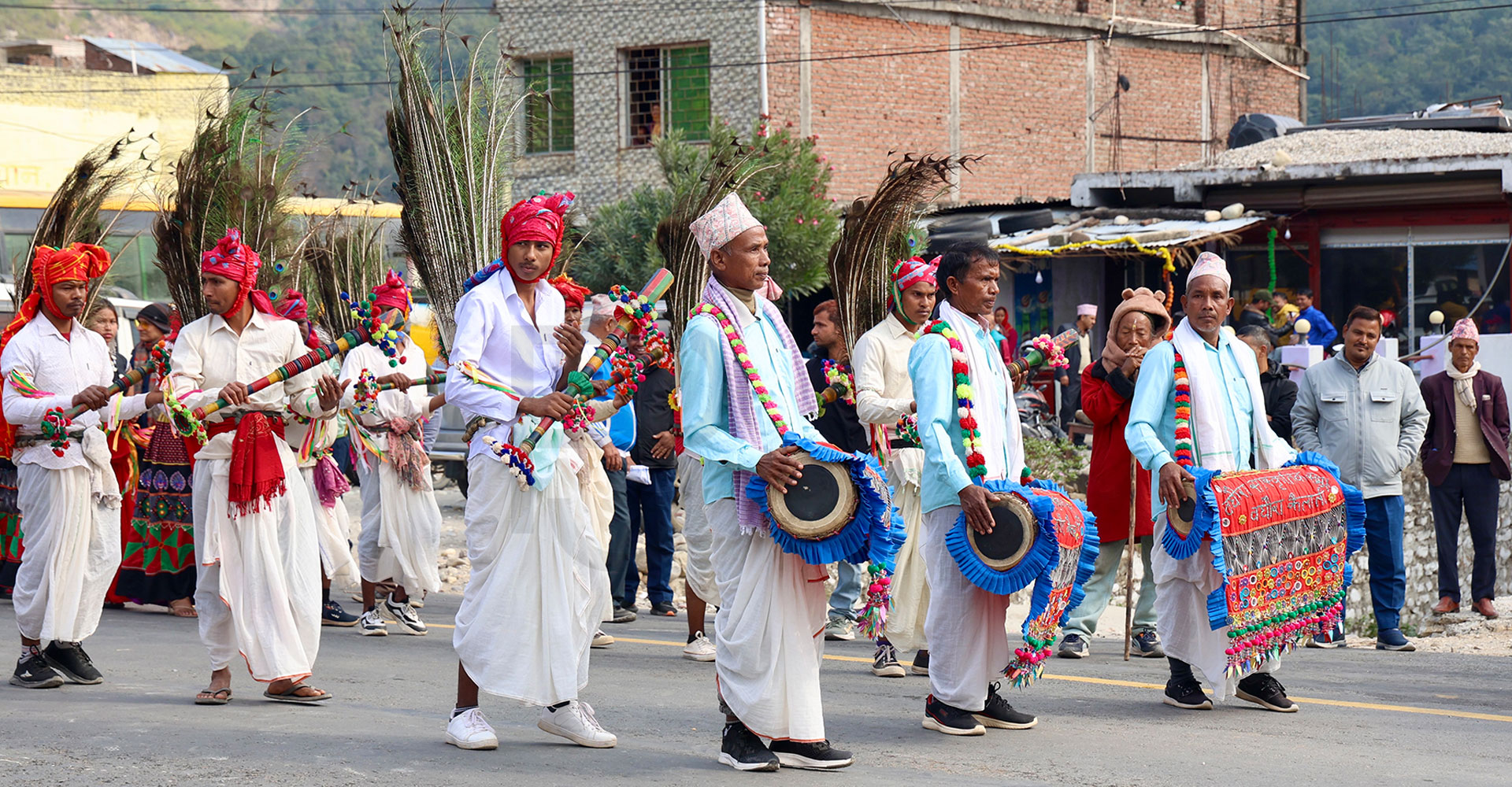 कैलाली जिल्लाको कर्णाली चिसापानीमा जालपादेवी केबलकारको बटम स्टेसनको शिलान्यास कार्यक्रमको अवसरमा थारु मुरहा नृत्य गर्दै कैलालीका स्थानीय थारु जातिका कलाकार