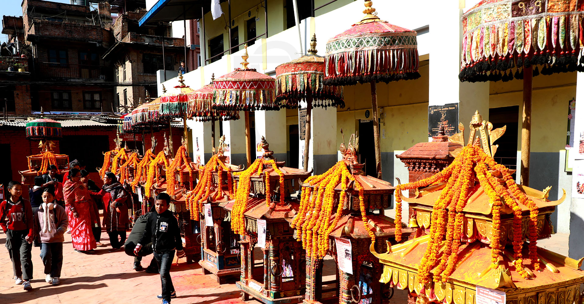 भक्तपुरको मध्यपुर थिमि नगरपालिकाद्वारा आयोजित तीनदिने मध्यपुर महोत्सवका अवसरमा लायकू दरबारमा प्रदर्शनी परिसरमा राखिएका बिस्का जात्रामा जात्रा गरिने विभिन्न देवताका खटहरू