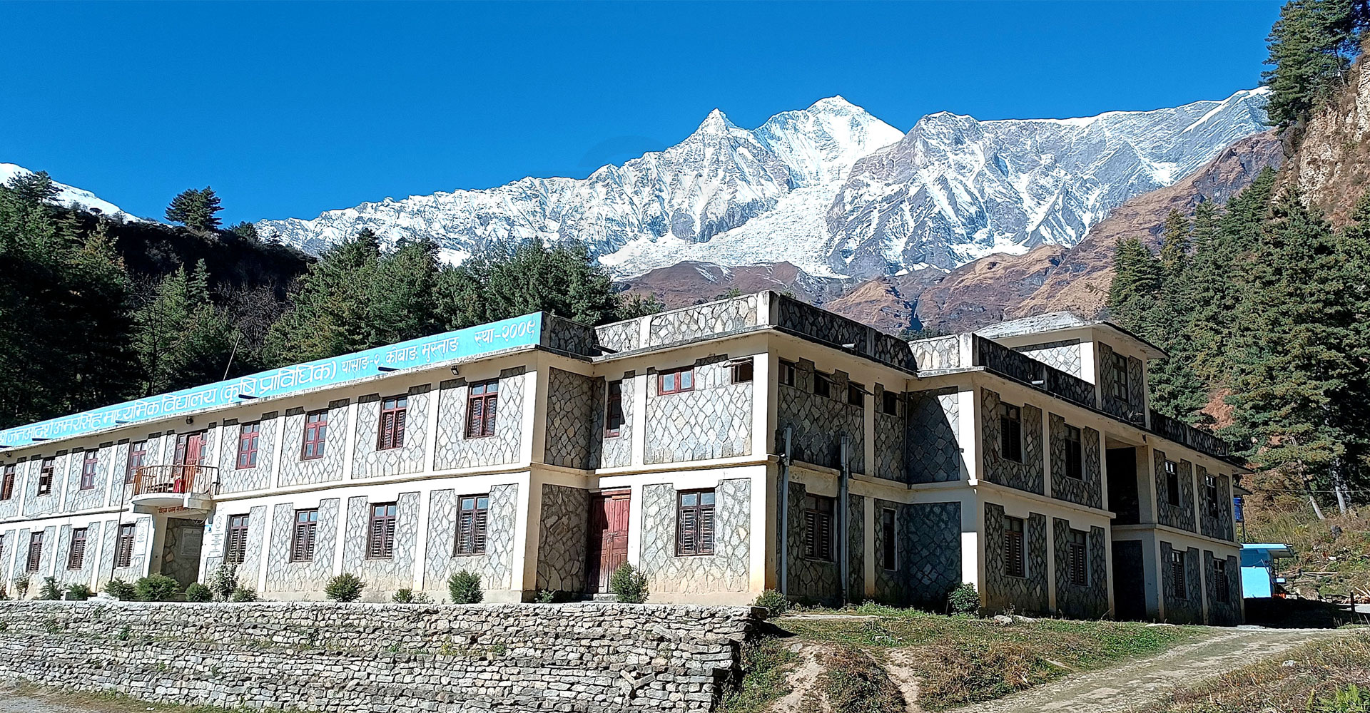 मुस्ताङ जिल्ला थासाङ गाउँपालिका-२ कोबाङमा रहेको मुस्ताङको एकमात्र कृषि प्राविधिक विषय पढाइ हुने श्री जनआदर्श अमरसिंह माध्यमिक विद्यालय र पृष्ठभूमिमा सेताम्मे हिउँसहितको धौलागिरी हिमाल