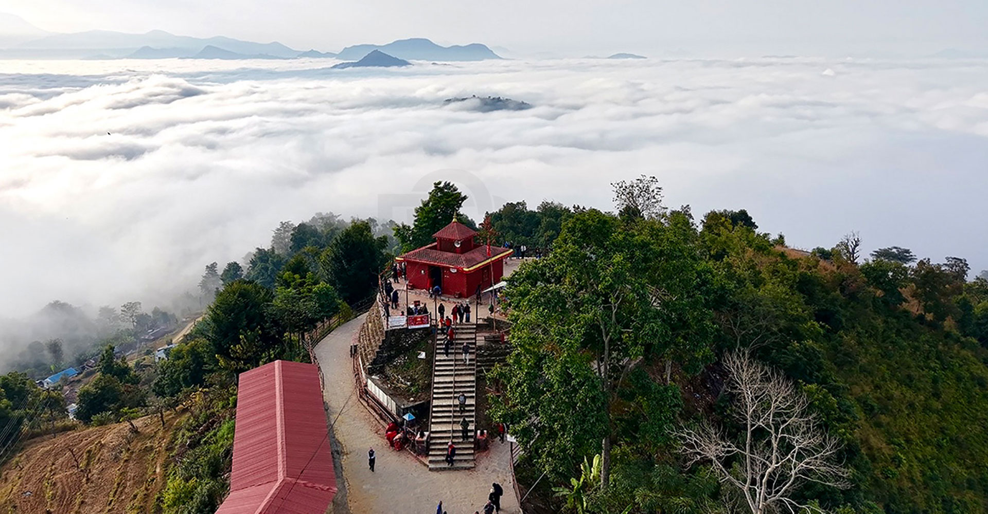 तनहुँको भानु नगरपालिका-९ बसन्तपुरस्थित थानीमाई मन्दिर र पृष्ठभूमिमा कुहिरोको दृश्य । यहाँ विभिन्न जिल्लाबाट पूजाअर्चना र फूलको डोली भित्र्याउन भक्तजनको घुइँचो लाग्ने गर्छ
