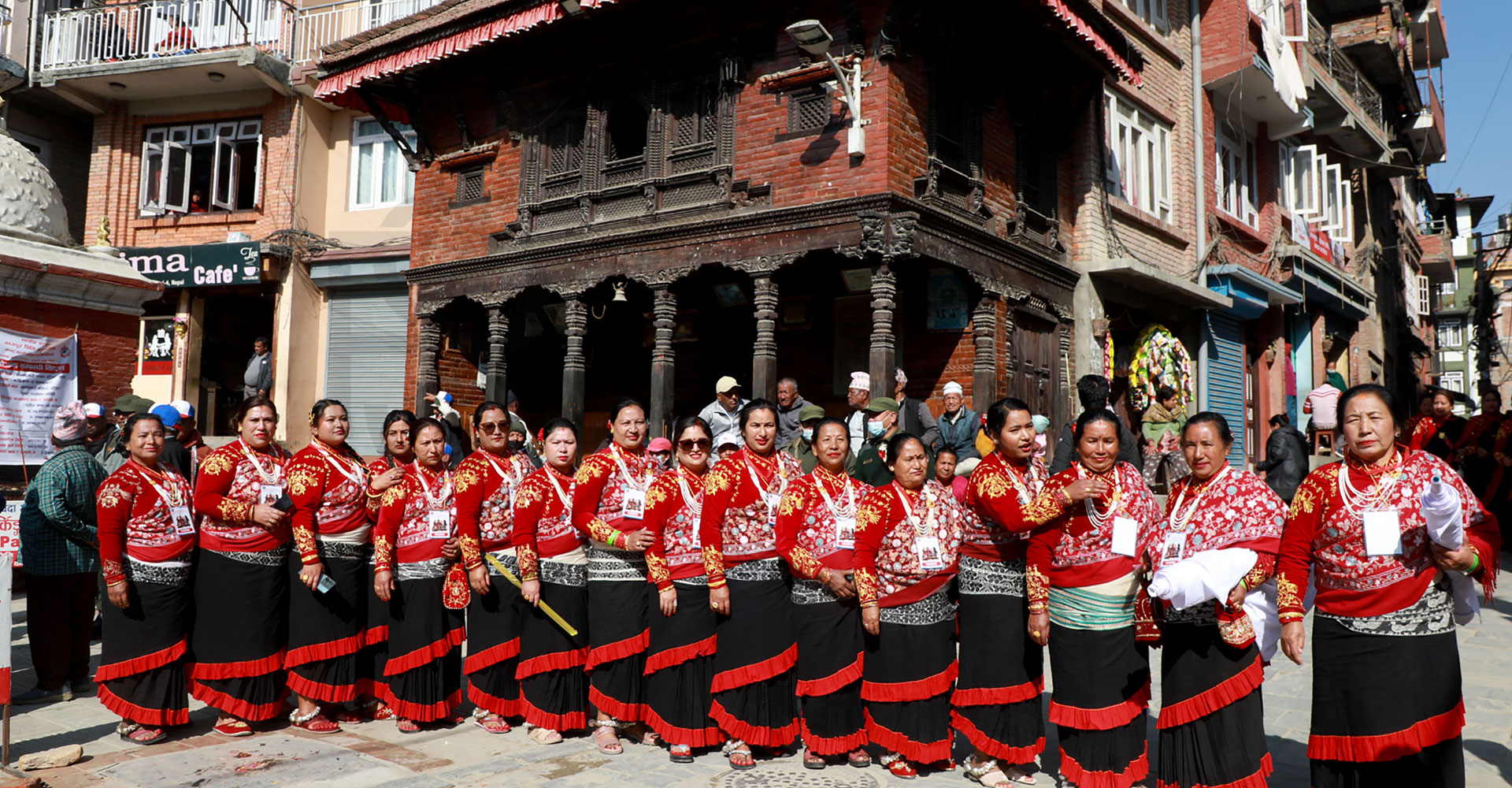 भक्तपुरको मध्यपुर थिमि बालकुमारी मन्दिर परिसरमा नवदुर्गा देवगण पूजाका लागि नेवारी पोशाक हाकुपटासीमा सजिएका महिला
