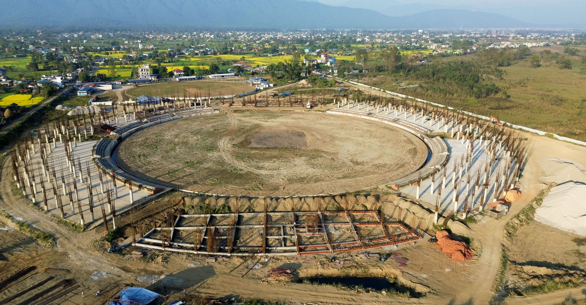 चितवनको भरतपुर–१५ स्थित रामपुरमा निर्माणाधीन गौतमबुद्ध अन्तर्राष्ट्रिय क्रिकेट रङ्गशाला । नयाँ सम्झौता अनुसार भइरहेको काम हालसम्म १३ प्रतिशत सकिएको आयोजनाले जनाएको छ