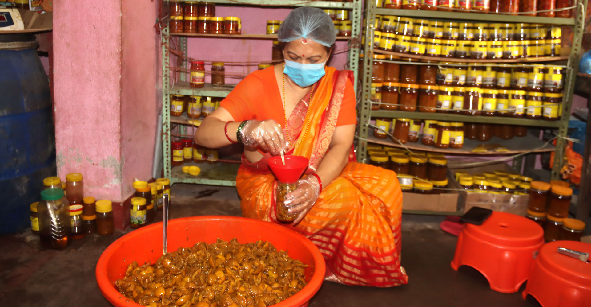 काठमाडौँ तारकेश्वर नगरपालिका-१० स्थित मनमैजुमा उद्यमी सरस्वती अधिकारीले घरमै सञ्चालन गरेको अचार उद्योगमा अचार बिक्रीका लागि बजार पठाउन ‘प्याकिङ’ गर्दै । उहाँले विभिन्न किसिमका अचार उत्पादन गरि बिक्री गर्दै आइरहनु भएको छ