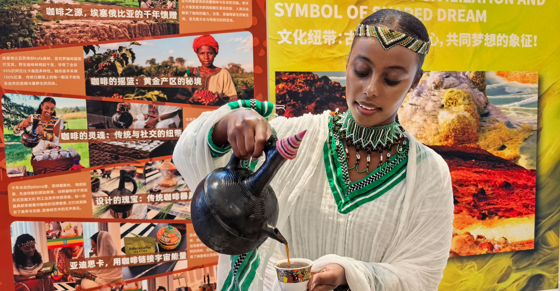 A woman pours Ethiopian coffee at an exchange event on business, culture and the arts between China and Ethiopia at the Embassy of Ethiopia in China in Beijing