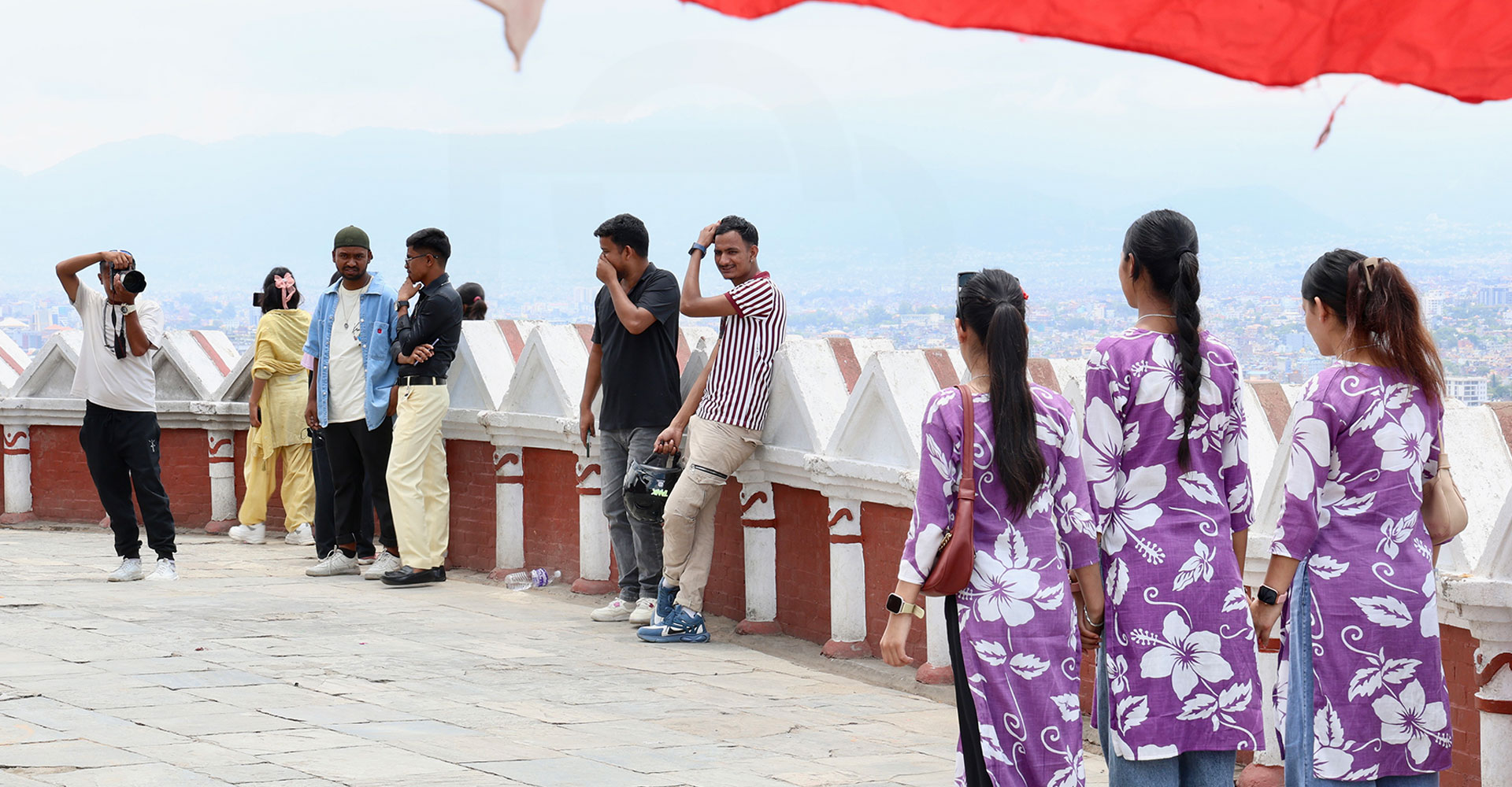 विश्वसम्पदा सूचीमा सूचीकृत स्वयम्भु महाचैत्यको शनिबार तस्बिर कैद गर्दै विदेशी पर्यटक