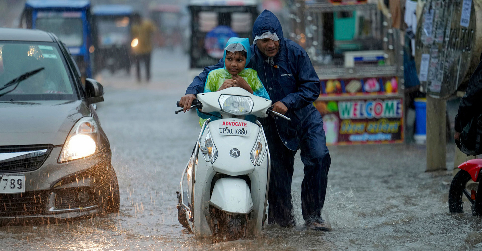 An Indian father takes his child back from school while dragging his scooter amidst heavy rain, in Prayagraj, India