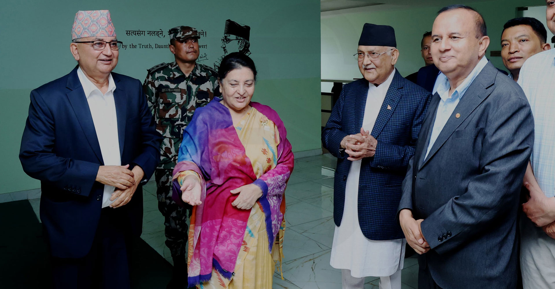 नेपाल कम्युनिष्ट पार्टी (एमाले) का अध्यक्ष एवं प्रधानमन्त्री केपी शर्मा ओली र पूर्वराष्ट्रपति विद्यादेवी भण्डारीबीच पार्टी मुख्यालय च्यासलमा आइतबार भेटवार्तापछि निस्कने क्रममा